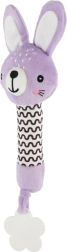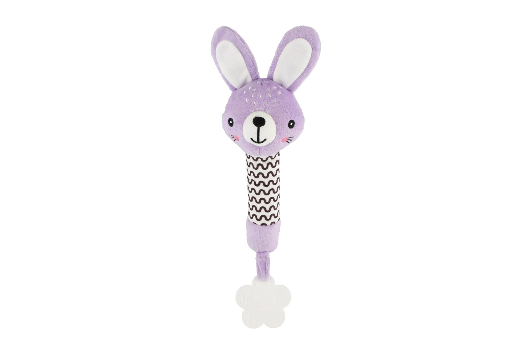 Το μωβ λούτρινο λαγουδάκι είναι ιδανικό πρώτο παιχνίδι για νεογέννητα. Η ελαφριά κατασκευή και το μακρύ μαλακό σώμα κρατιούνται άνετα σε μικρά χεράκια και με το πάτημα παράγουν απαλό ήχο σφυρίχτρας, που φυσικά τραβά την προσοχή του μωρού και υποστηρίζει την αντίληψη των ήχων.