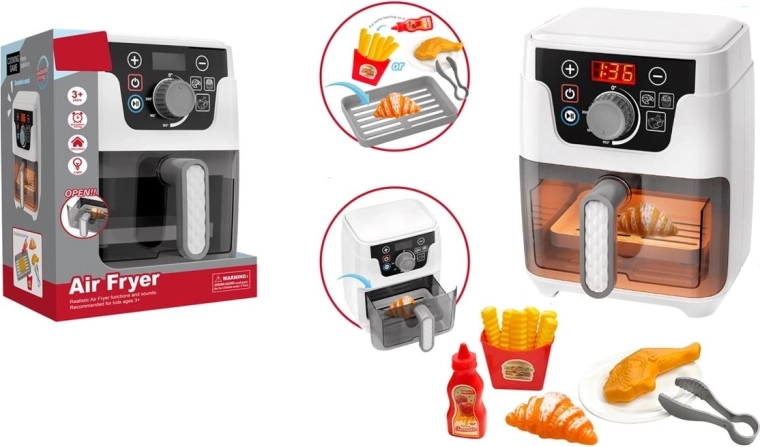 Ρεαλιστική παιδική φριτέζα Air Fryer με φωτεινά και ηχητικά εφέ που θα ενθουσιάσει τους μικρούς σεφ. Προσφέρει πάνελ ελέγχου με κουμπιά και ακριβές περιστροφικό επιλογέα, κινητό συρτάρι και προσομοίωση ψησίματος για ακόμη πιο αληθοφανές παιχνίδι. Ιδανική για παιδική κουζίνα, κατάστημα και εστιατόριο, ασφαλής από 3+ ετών.