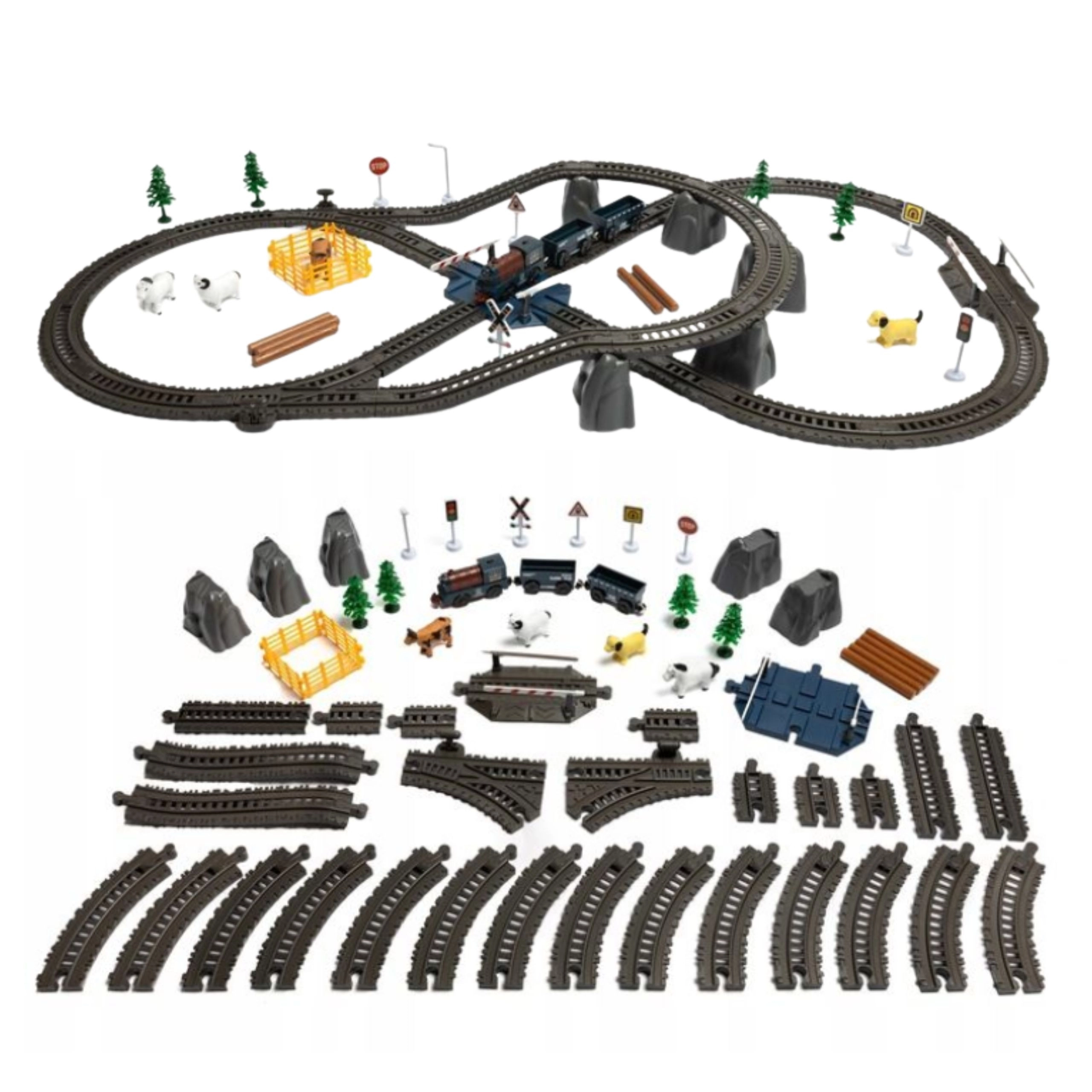 Φορτηγά βαγόνια, φιγούρες ζώων, δέντρα, πινακίδες κυκλοφορίας και ισόπεδη διάβαση με μπάρες επεκτείνουν τις δυνατότητες του παιχνιδιού και ενισχύουν τη φαντασία.