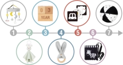 - κρεμαστό μόμπιλε, αντιθετικές κάρτες, απαλή μπάλα, λούτρινο κουνελάκι, τσαλακωτό αντιθετικό βιβλιαράκι, ξύλινο μασητικό “Κουνελάκι”, ξύλινα μπλοκ οροσήμων