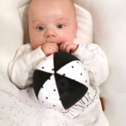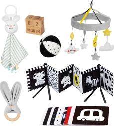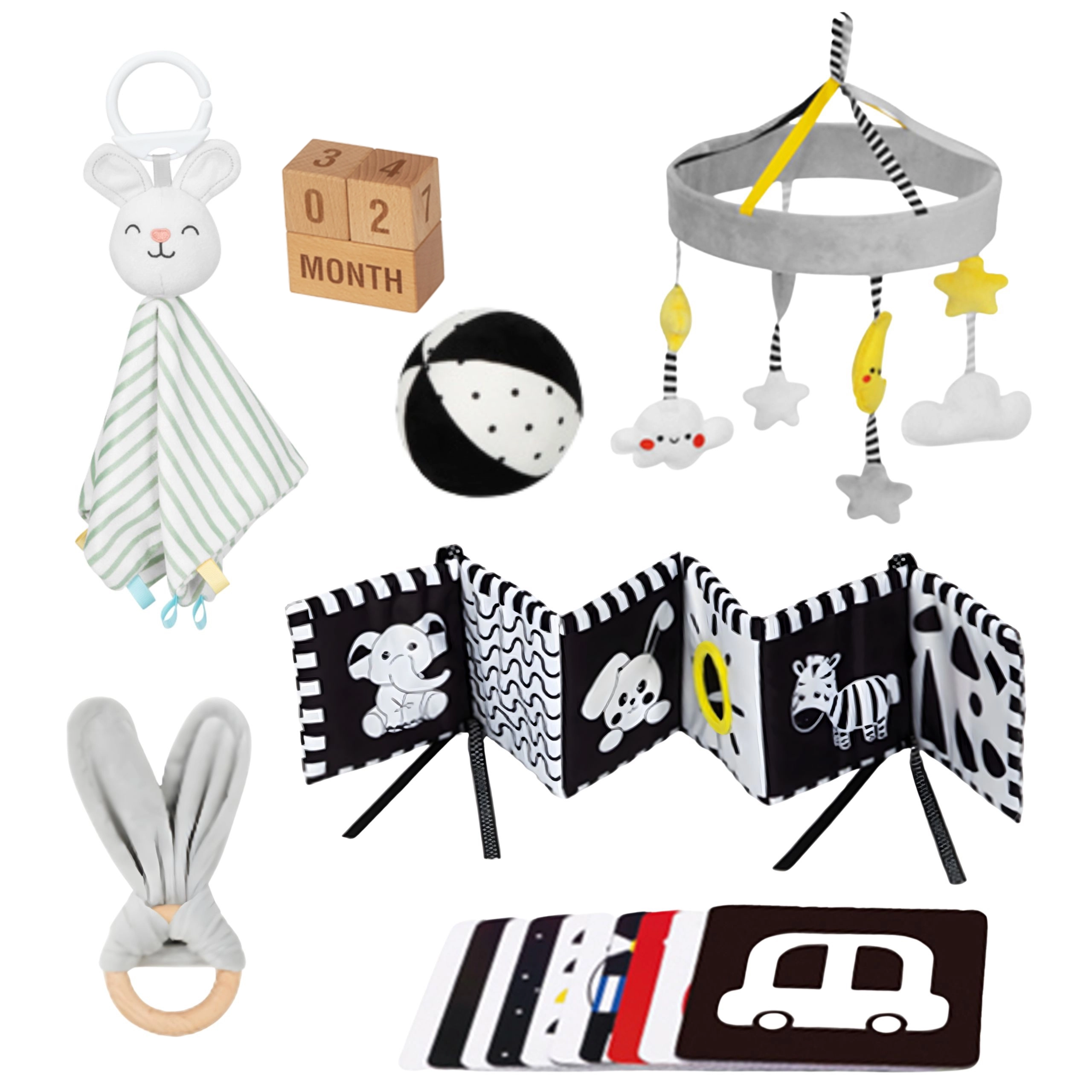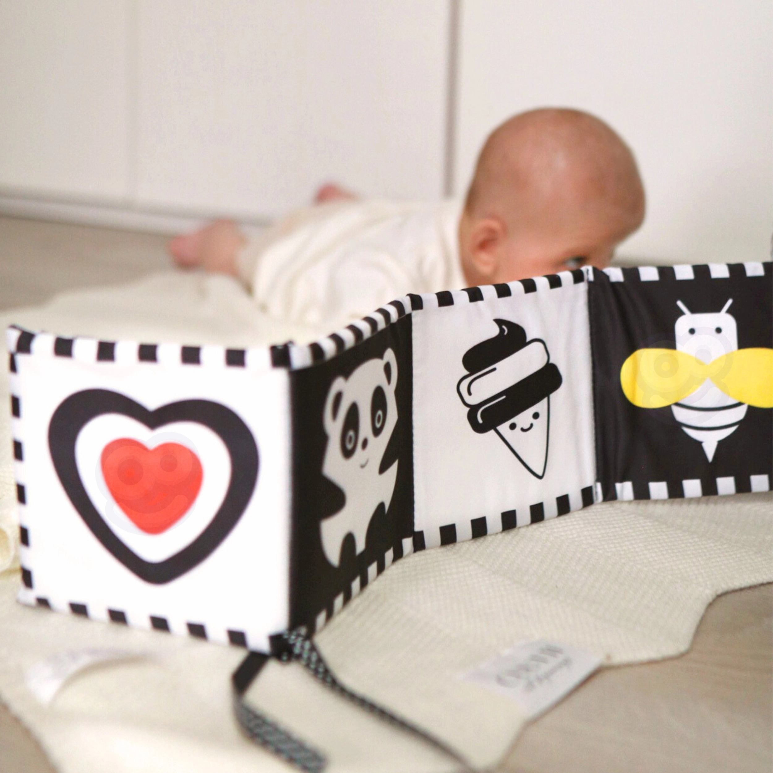 Τα ασπρόμαυρα μοτίβα στις κάρτες, στο υφασμάτινο βιβλιαράκι και στον πίνακα τραβούν φυσικά το βλέμμα του νεογέννητου, υποστηρίζουν την πρώτη εστίαση και παρατείνουν τον χρόνο συγκέντρωσης κατά το tummy time.