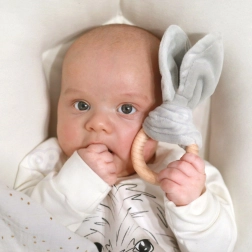Το ξύλινο μασητικό με υφασμάτινα “αυτάκια” κρατιέται εύκολα ακόμη και από τα πιο μικρά χεράκια, βοηθά στο πρώτο δόντιασμα και υποστηρίζει τον συντονισμό χεριού–ματιού.