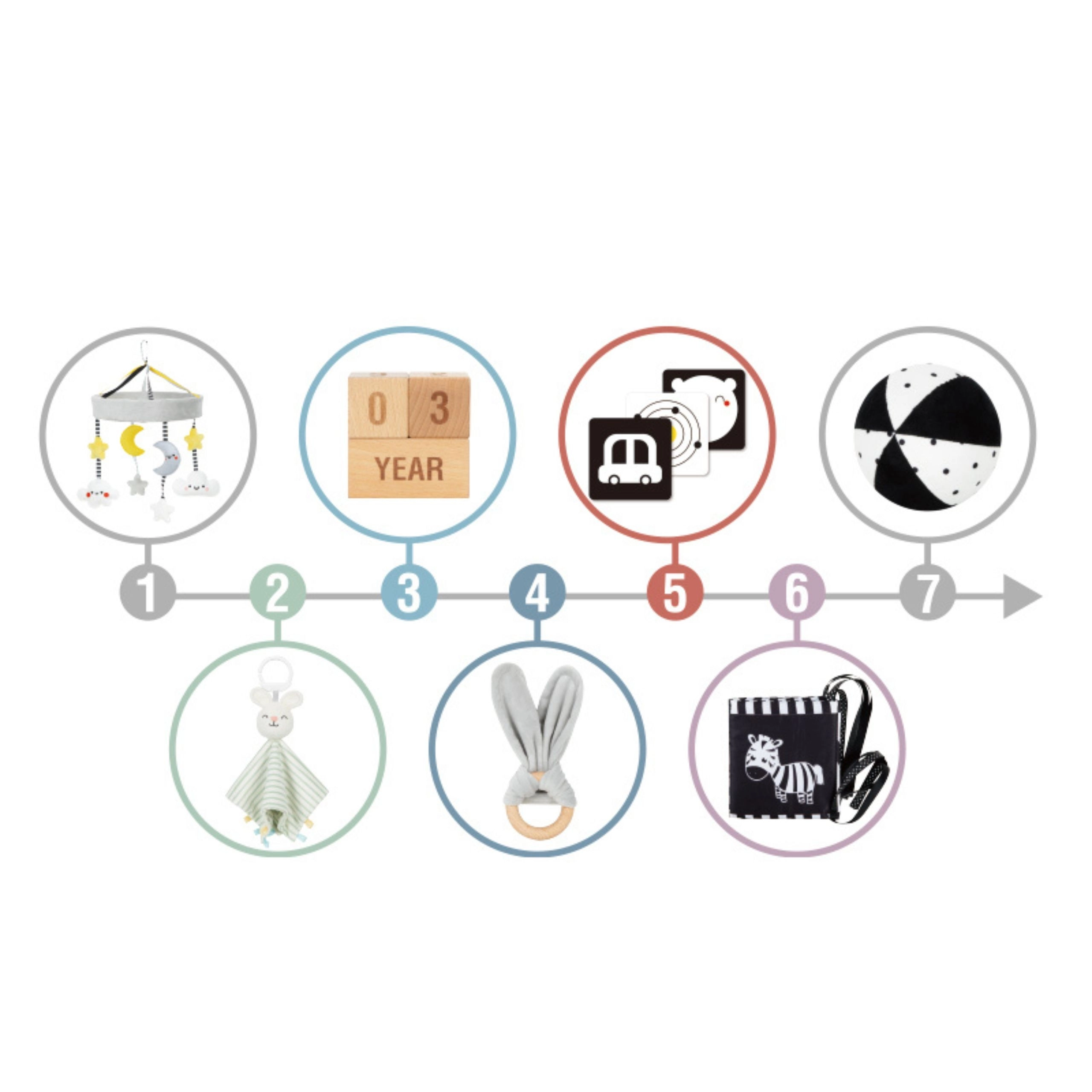 Αυτό το μελετημένο σετ προσφέρει 6 διδακτικά βοηθήματα και αξεσουάρ για την αποτύπωση οροσήμων. Τα μοτίβα υψηλής αντίθεσης τραβούν την προσοχή του μωρού και υποστηρίζουν τον οπτικό αναπτυξιακό τομέα, ενώ οι απαλές υφές προσκαλούν σε απτική εξερεύνηση. Οι ελαφριές, ασφαλείς και εύκολες στο πιάσιμο κατασκευές ενθαρρύνουν τη λεπτή κινητικότητα και το πρώτο συγκεντρωμένο παιχνίδι.