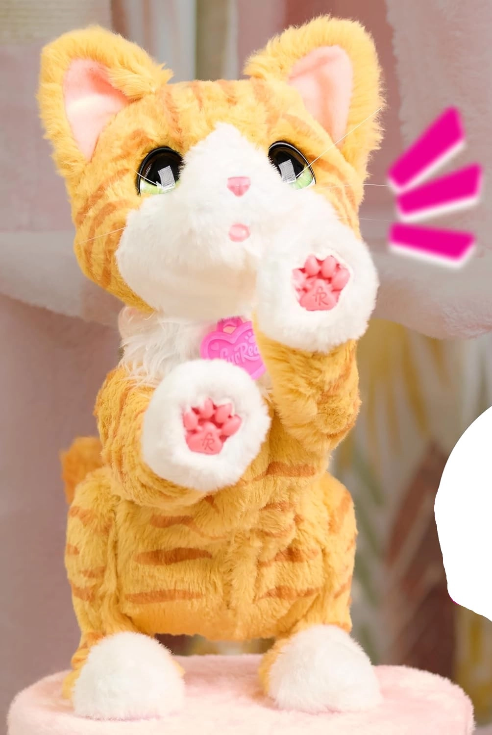 Γνωρίστε τη Bella – έναν απαλό σύντροφο με ρεαλιστική συμπεριφορά που τα παιδιά αγαπούν. Έχει ευχάριστο στην αφή, αφράτο τρίχωμα, λαμπερά πράσινα μάτια και κολάρο με καρδούλα. Αντιδρά στο χάδι στο κεφάλι με γαργαλητά/μουρμουρητά, νιαουρίσματα και χαρούμενους ήχους, δίνοντας την αίσθηση ενός ζωντανού γατιού.