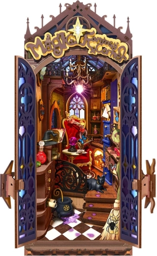 Φτιάξτε στο σπίτι τη δική σας Μαγική Γωνιά – μια μινιατούρα σκηνή με την ατμόσφαιρα ενός παλιού μαγικού θαλάμου. Με το άναμμα των LED αναδεικνύονται τα θολωτά παράθυρα, η κόκκινη πολυθρόνα με ψηλή πλάτη, η ελικοειδής σκάλα και το τζάκι. Δεν λείπουν τα ράφια με ειλητάρια και φιαλίδια φίλτρων, το καπέλο μάγου, το ξύλινο ραβδί, οι λαμπερές κρυστάλλοι και μια μαύρη γάτα ως πιστός σύντροφος.