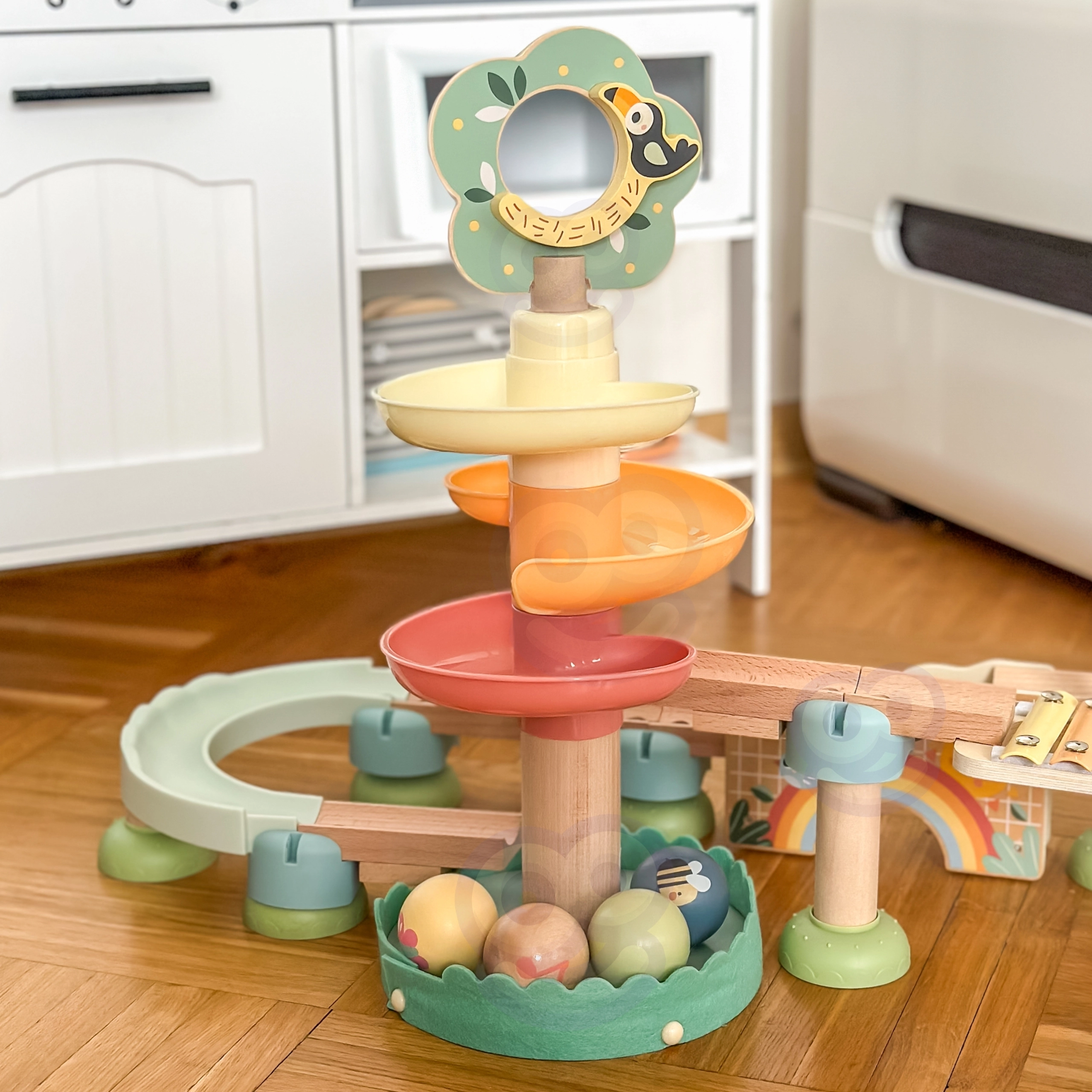 Πολυεπίπεδες σπείρες και καμπύλες ράμπες εξασφαλίζουν ομαλή κίνηση των μπιλιών και βοηθούν τα παιδιά να κατανοήσουν τη βαρύτητα και το αιτία–αποτέλεσμα.