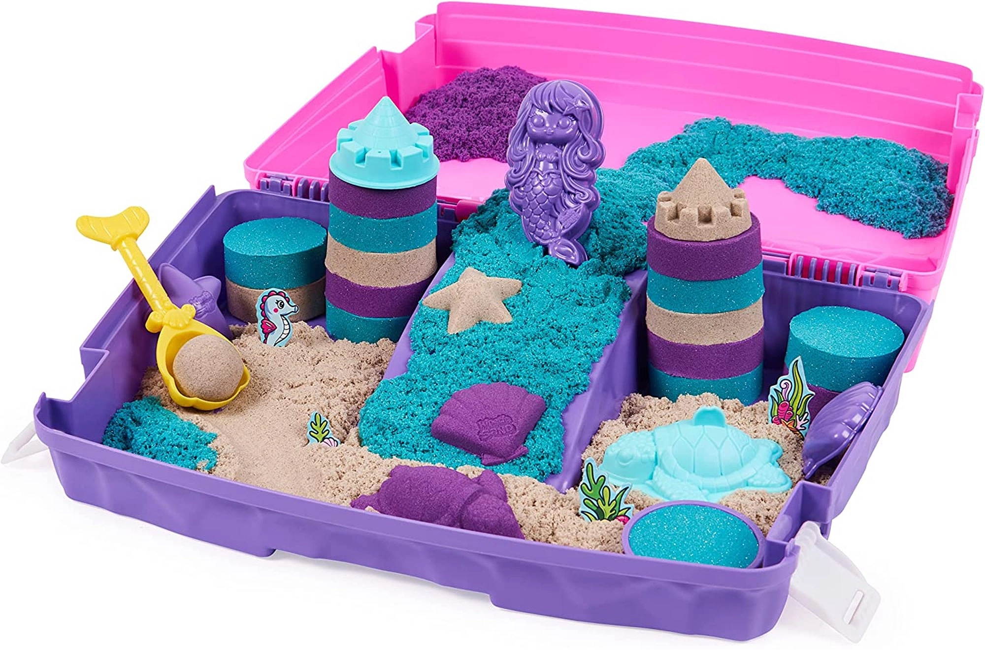 Το σετ Mermaid Palace σε πρακτικό βαλιτσάκι προσφέρει 934 g άμμου σε 3 χρώματα και μια συλλογή από καλούπια και εργαλεία για τη δημιουργία θαλάσσιου βασιλείου. Η άμμος περιέχει φυσικό συστατικό, είναι ευχάριστα πλαστική, δεν στεγνώνει ποτέ και ενισχύει τη λεπτή κινητικότητα και τη φαντασία των παιδιών. Το βαλιτσάκι λειτουργεί ως δίσκος παιχνιδιού και ως κουτί αποθήκευσης, ιδανικό για ταξίδια και τακτοποιημένο παιχνίδι στο σπίτι.