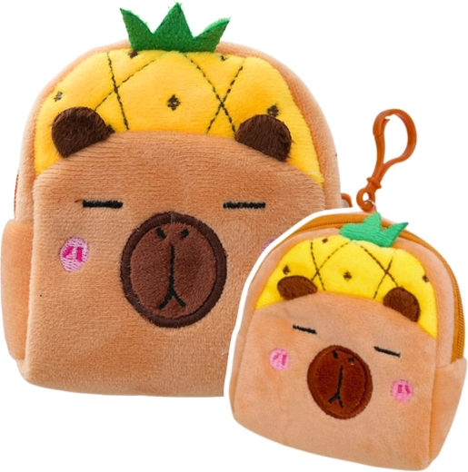 Αυτό το χαριτωμένο λούτρινο πορτοφολάκι με καπιμπάρα και καπελάκι ανανά τραβά το βλέμμα από την πρώτη στιγμή. Το απαλό υλικό είναι ευχάριστο στην αφή, ενώ το πρακτικό φερμουάρ κρατά νομίσματα, χαρτονομίσματα, κλειδιά και μικρά αξεσουάρ ασφαλή. Χάρη στο πλαστικό καραμπινεράκι το προσαρτάτε εύκολα σε σακίδιο, τσάντα ή θηλιά παντελονιού.