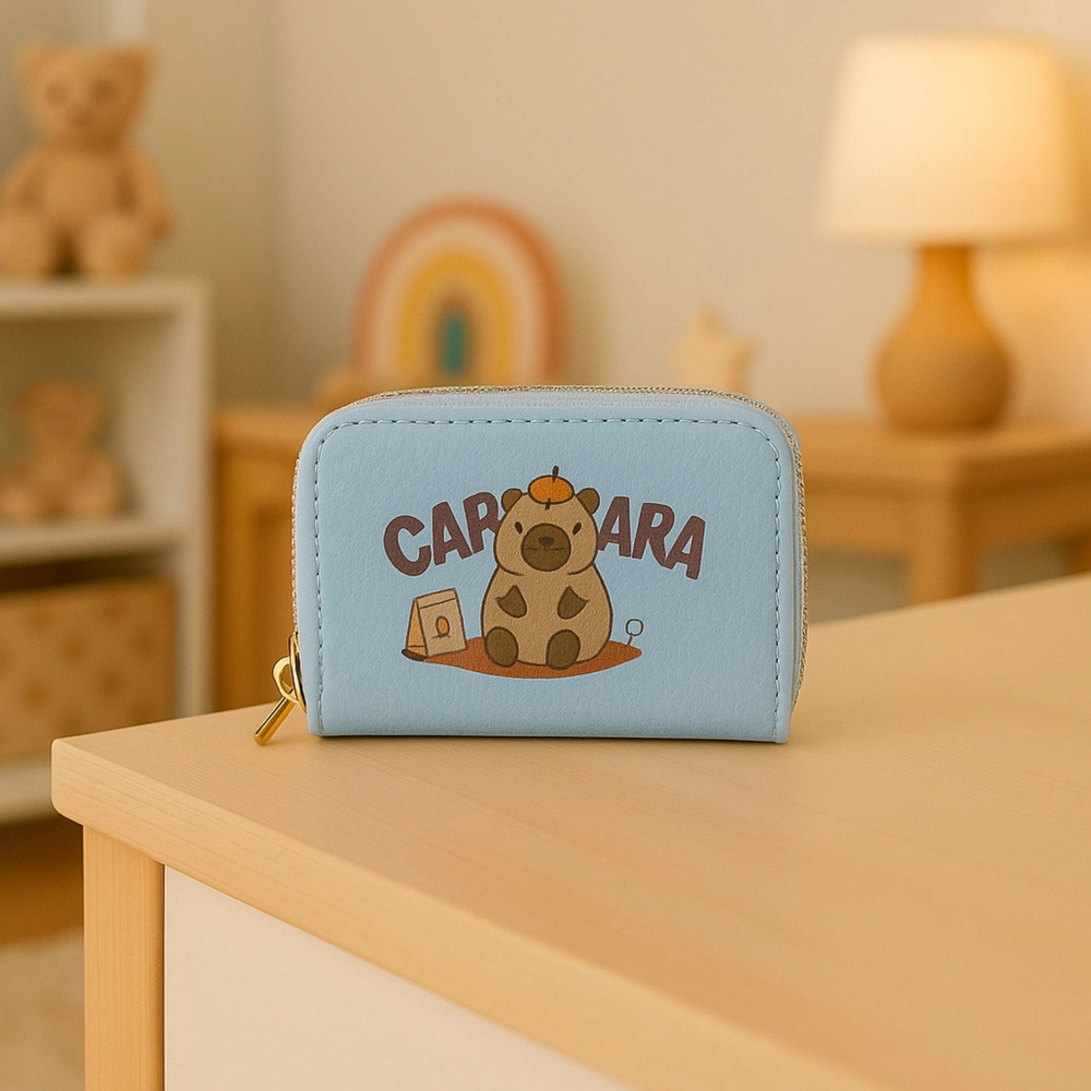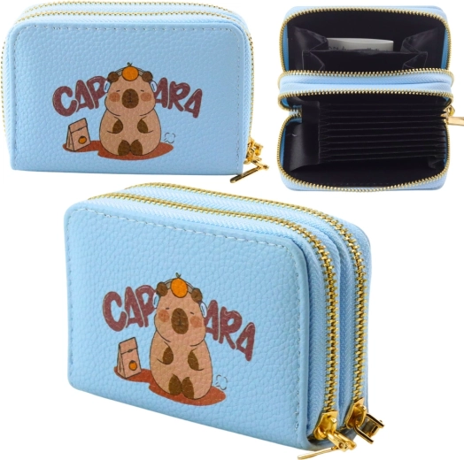 Αυτό το ανοιχτό μπλε πορτοφόλι συνδυάζει παιχνιδιάρικο σχέδιο με καπιμπάρα και πρακτική οργάνωση. Δύο χρυσά φερμουάρ χωρίζουν τον αποθηκευτικό χώρο, ώστε να κατανέμετε εύκολα κάρτες, μετρητά, κέρματα και αποδείξεις. Η εσωτερική κατασκευή τύπου ακορντεόν προσφέρει γρήγορη επισκόπηση και άνετη πρόσβαση.