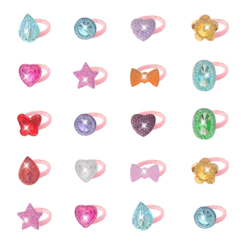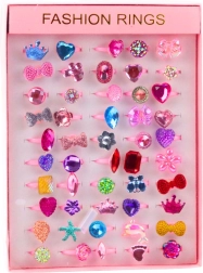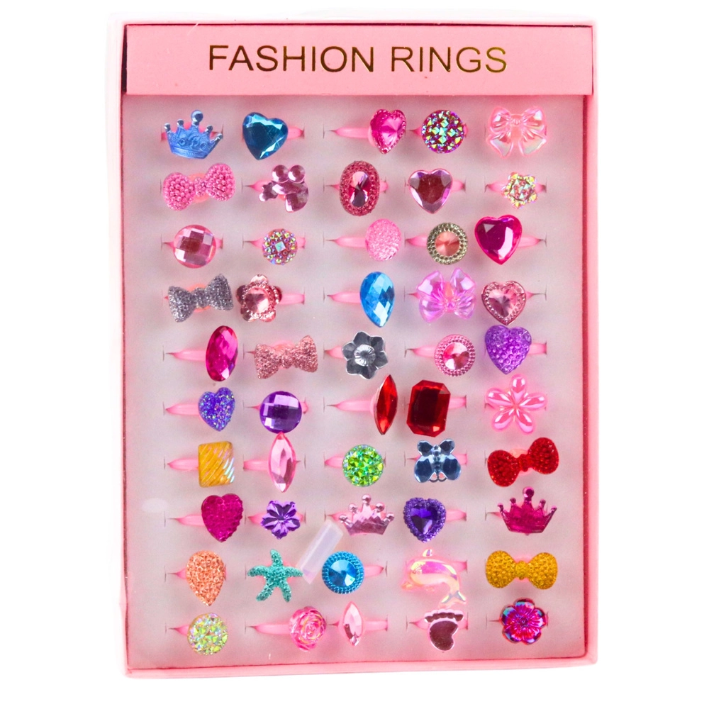 Σετ παιχνιδιού γεμάτο φαντασία: 50 πολύχρωμα δαχτυλιδάκια με μοτίβα καρδούλες, αστεράκια, κορονίτσες, φιογκάκια, λουλουδάκια και μεγάλους «κρυστάλλους» θα ενθουσιάσουν κάθε μικρή φίλη της μπιζουτερί. Οι γυαλιστερές, πολυεδρικές πετρούλες αντανακλούν υπέροχα το φως και χαρίζουν μοναδική λάμψη σε κάθε κοστούμι και στο καθημερινό παιχνίδι.