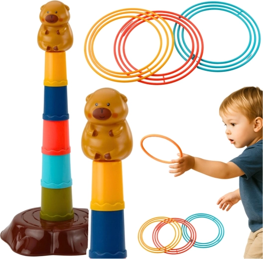 Αυτό το παιδικό παιχνίδι ρίψης με κρίκους συνδυάζει το χαρούμενο θέμα της καπιμπάρας με την εύκολη συναρμολόγηση ενός πύργου πέντε επιπέδων. Ο στόχος είναι να ρίχνουν οι παίκτες τους κρίκους ώστε να καταλήγουν στον πύργο – τα παιδιά έτσι εξασκούν φυσικά την ακρίβεια, τη συγκέντρωση και τον οφθαλμοχειρικό συντονισμό. Τα ελαφριά και ασφαλή πλαστικά κομμάτια κρατιούνται άνετα και είναι κατάλληλα και για μικρότερα παιδιά.