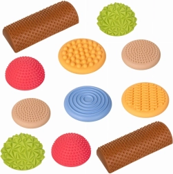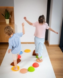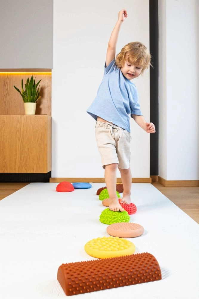 Το σετ περιλαμβάνει συνδυασμό θόλων, δίσκων και ημικύλινδρων, που μπορούν να τοποθετηθούν ελεύθερα σε ευθείες γραμμές ή σε παιχνιδιάρικους κύκλους. Χάρη στη σταθερή αλλά εύκαμπτη κατασκευή και την αντιολισθητική επιφάνεια, τα κομμάτια είναι ασφαλή σε επίπεδα δάπεδα και σε στρώματα γυμναστικής. Κατάλληλα για οικιακή άσκηση, νηπιαγωγεία, σχολεία, φυσικοθεραπεία και αισθητηριακή ολοκλήρωση.