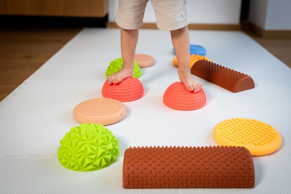 Θόλοι, δίσκοι και ημικύλινδροι με προεξοχές και μοτίβα ενεργοποιούν τους υποδοχείς των πελμάτων, βελτιώνουν την ιδιοδεκτικότητα και υποστηρίζουν τη φυσική κύλιση του ποδιού.