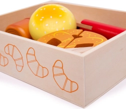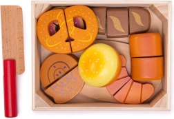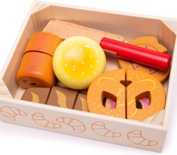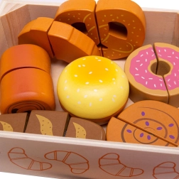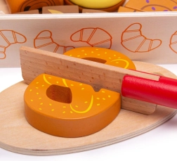Κάθε κομμάτι αρτοσκευάσματος συνδέεται με αυτοκόλλητο βέλκρο και μπορεί να κοπεί με το ξύλινο μαχαίρι για ρεαλιστικό παιχνίδι.