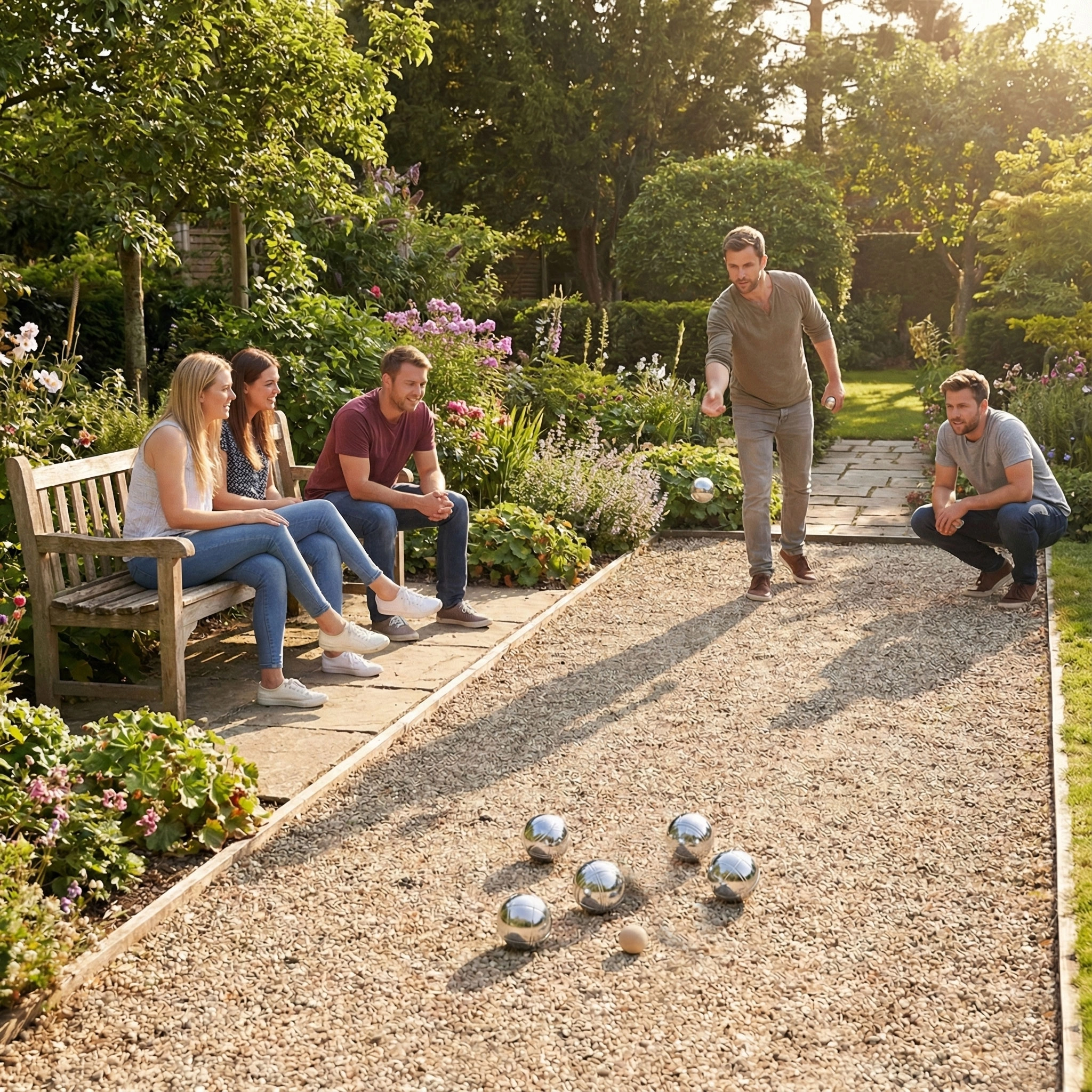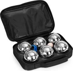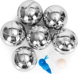 Το σετ περιλαμβάνει 6 ανθεκτικές μπάλες από χρωμιωμένο ατσάλι με διάμετρο 72 mm και βάρος περίπου 700 g για άνετη και σταθερή ρίψη. Δύο διαφορετικά σχέδια ραβδώσεων διευκολύνουν τη διάκριση των μπαλών στο παιχνίδι. Το ξύλινο κοσονέ λειτουργεί ως στόχος και η μεζούρα/σχοινί μέτρησης βοηθά στην αμερόληπτη επίλυση αμφισβητούμενων φάσεων.