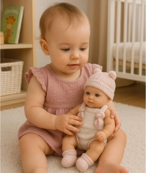 Η κούκλα έχει κινούμενα χεράκια, ποδαράκια και κεφαλάκι, ώστε να μπορεί εύκολα να καθίσει, να ξαπλώσει και να ντυθεί. Τα αποσπώμενα ρουχαλάκια ενισχύουν το δημιουργικό παιχνίδι, την ανάπτυξη λεπτής κινητικότητας και τις παιχνιδό-ιστορίες ρόλων που σχετίζονται με τη φροντίδα μωρού.