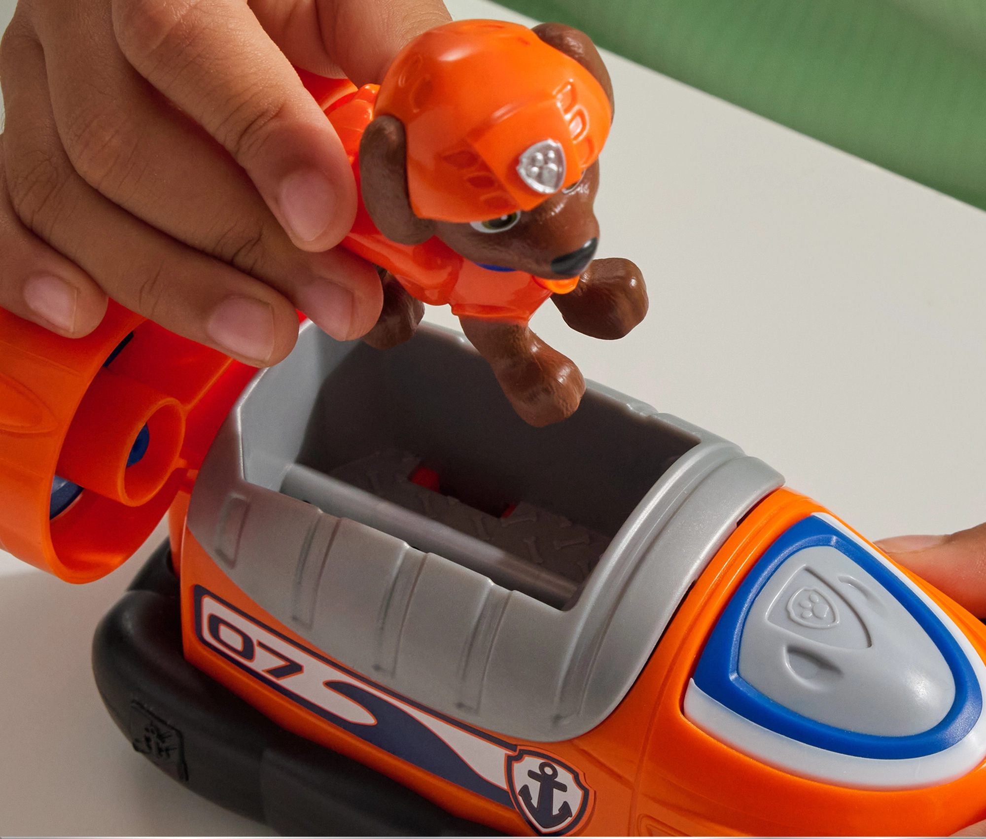 Ξεκινήστε υδάτιες αποστολές διάσωσης με το κουτάβι Zuma, τον ναυαγοσώστη του PAW PATROL. Το στιλάτο πορτοκαλί‑γκρι hovercraft με κινούμενους τροχούς εξασφαλίζει ομαλή κίνηση στο πάτωμα, ενώ η πιστή φιγούρα του Zuma με πορτοκαλί εξάρτυση και κράνος προετοιμάζει τα παιδιά για ώρες δημιουργικού παιχνιδιού.