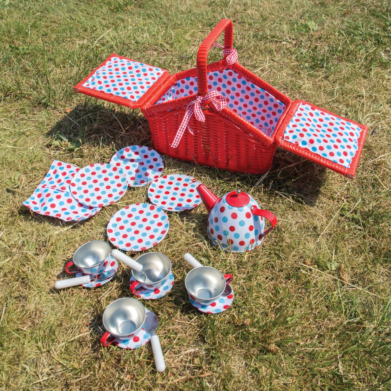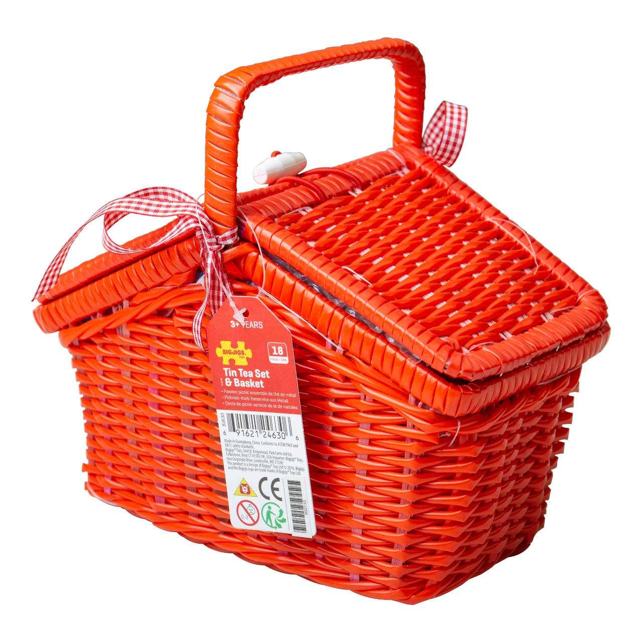 Γοητευτικό σετ τσαγιού σε κόκκινο ψάθινο καλάθι που φέρνει χαρά στο παιχνίδι. Περιλαμβάνει τέσσερα φλιτζάνια, πιατάκια, τσαγιέρα με κουταλάκια, ιδανικό για παιδικά τσαϊά στο σπίτι και στις εκδρομές.