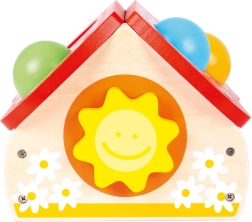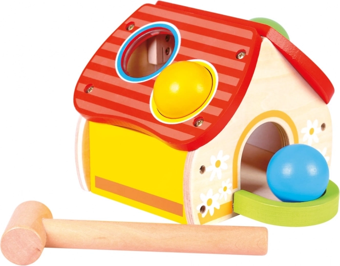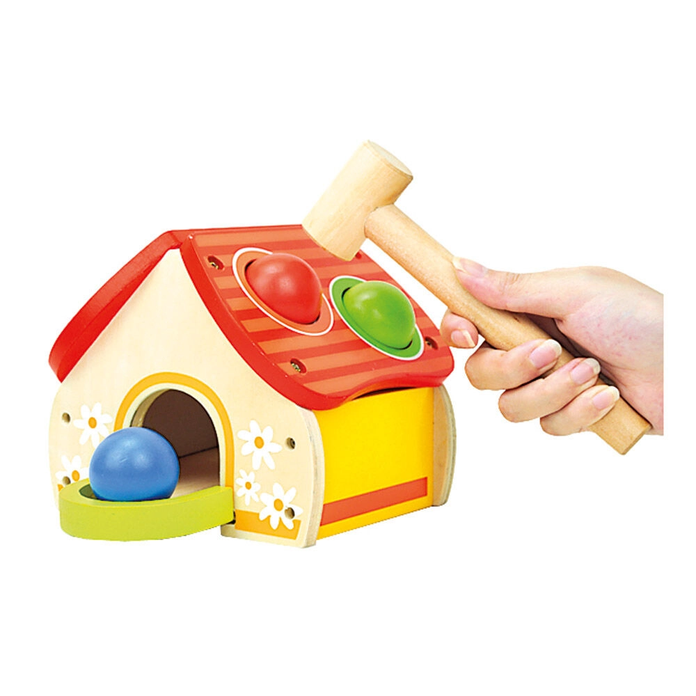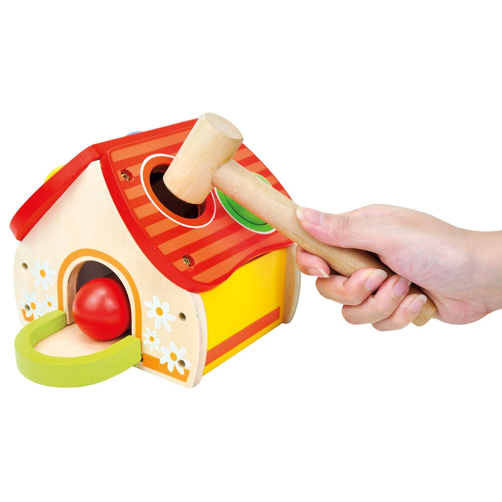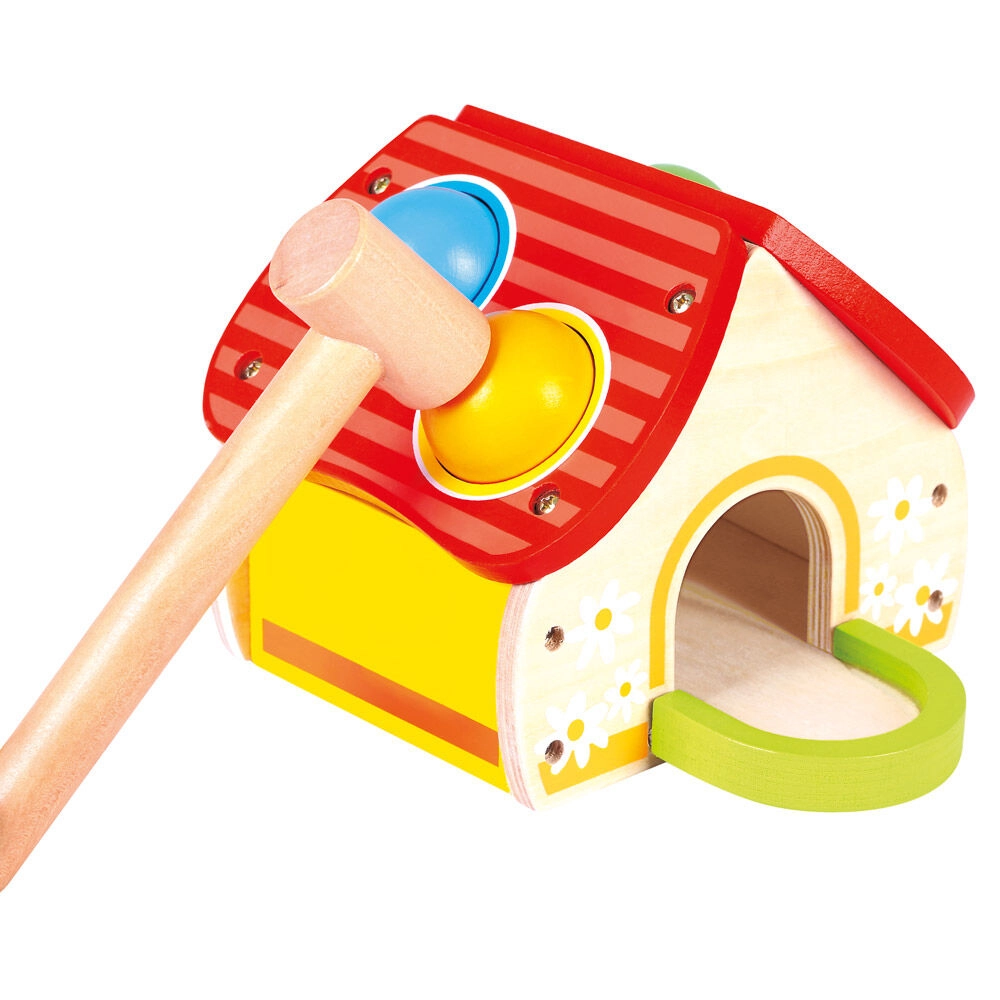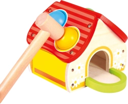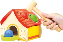Αυτό το ποιοτικό ξύλινο παιχνίδι σε μορφή χαρούμενου σπιτιού κερδίζει τα παιδιά με τα ζωηρά χρώματα και την απλή αρχή του παιχνιδιού – οι μπάλες τοποθετούνται στις τρύπες της στέγης και καρφώνονται απαλά με το σφυράκι. Η διασκέδαση υποστηρίζει την ανάπτυξη κινητικών δεξιοτήτων, υπομονής και ακρίβειας.