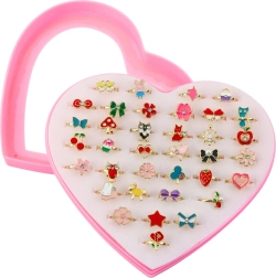 Αυτό το πολύχρωμο σετ δαχτυλιδιών θα ενθουσιάσει όλες τις μικρές καλονές. Χάρη στη ρυθμιζόμενη διάμετρο τα δαχτυλίδια προσαρμόζονται εύκολα στα παιδικά δαχτυλάκια και προσφέρουν άνετη και ασφαλή χρήση. Το διάφανο καπάκι της καρδιόσχημης θήκης επιτρέπει τακτοποιημένη αποθήκευση και γρήγορη επιλογή αγαπημένων μοτίβων.