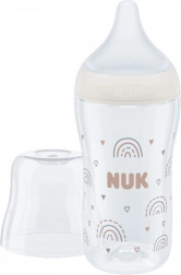 Ο ενσωματωμένος δείκτης ελέγχου θερμοκρασίας NUK αλλάζει χρώμα από μπλε (κρύο) σε λευκό (πολύ ζεστό), βοηθώντας να αποφευχθεί η χορήγηση υπερβολικά ζεστού γεύματος. Η ιδανική θερμοκρασία είναι γύρω στους 37 °C, όταν ο δείκτης είναι μπλε. Η φιάλη είναι κατασκευασμένη από ανθεκτικό, υγιεινό γυαλί, είναι χωρίς BPA και πληροί το ευρωπαϊκό πρότυπο EN 14350.