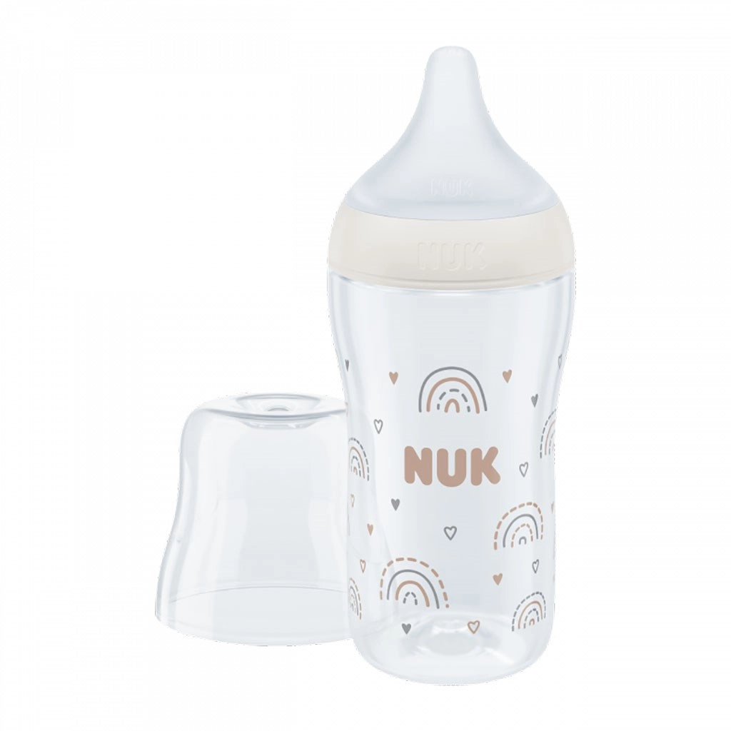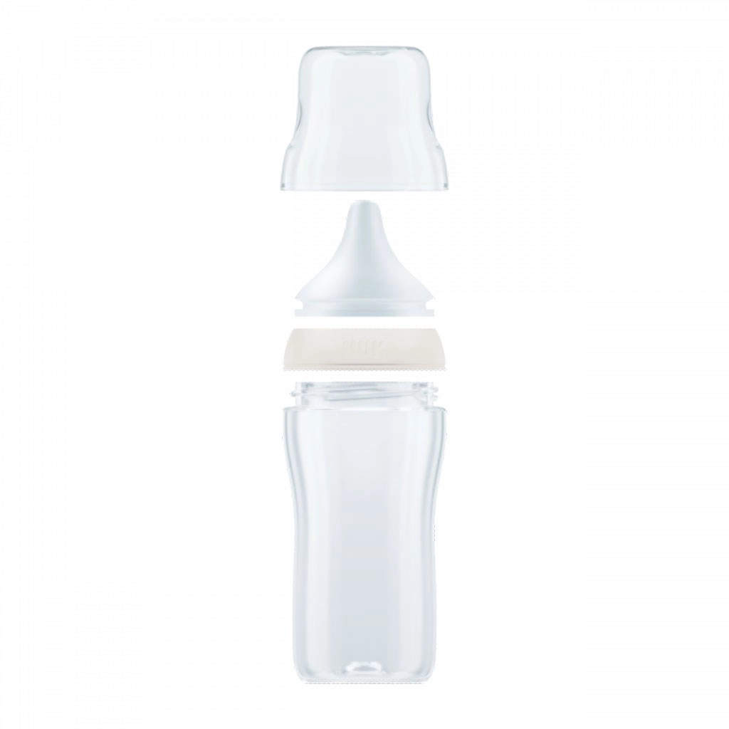 Το γυάλινο μπουκάλι NUK Perfect Match μιμείται το φυσικό αίσθημα του θηλασμού – διαθέτει ειδικό ορθοδοντικό σχήμα βασισμένο στη θηλή της μητέρας, άφθονο χώρο για την κίνηση της γλώσσας και των γνάθων και φαρδιά στήριξη χειλιών που θυμίζει την επιδερμίδα της μαμάς. Χάρη στο βελτιωμένο Anti Colic Air System, η ροή του γάλακτος είναι φυσική και ήρεμη, ώστε το μωρό να πίνει χαλαρά χωρίς περιττή κατάποση αέρα.