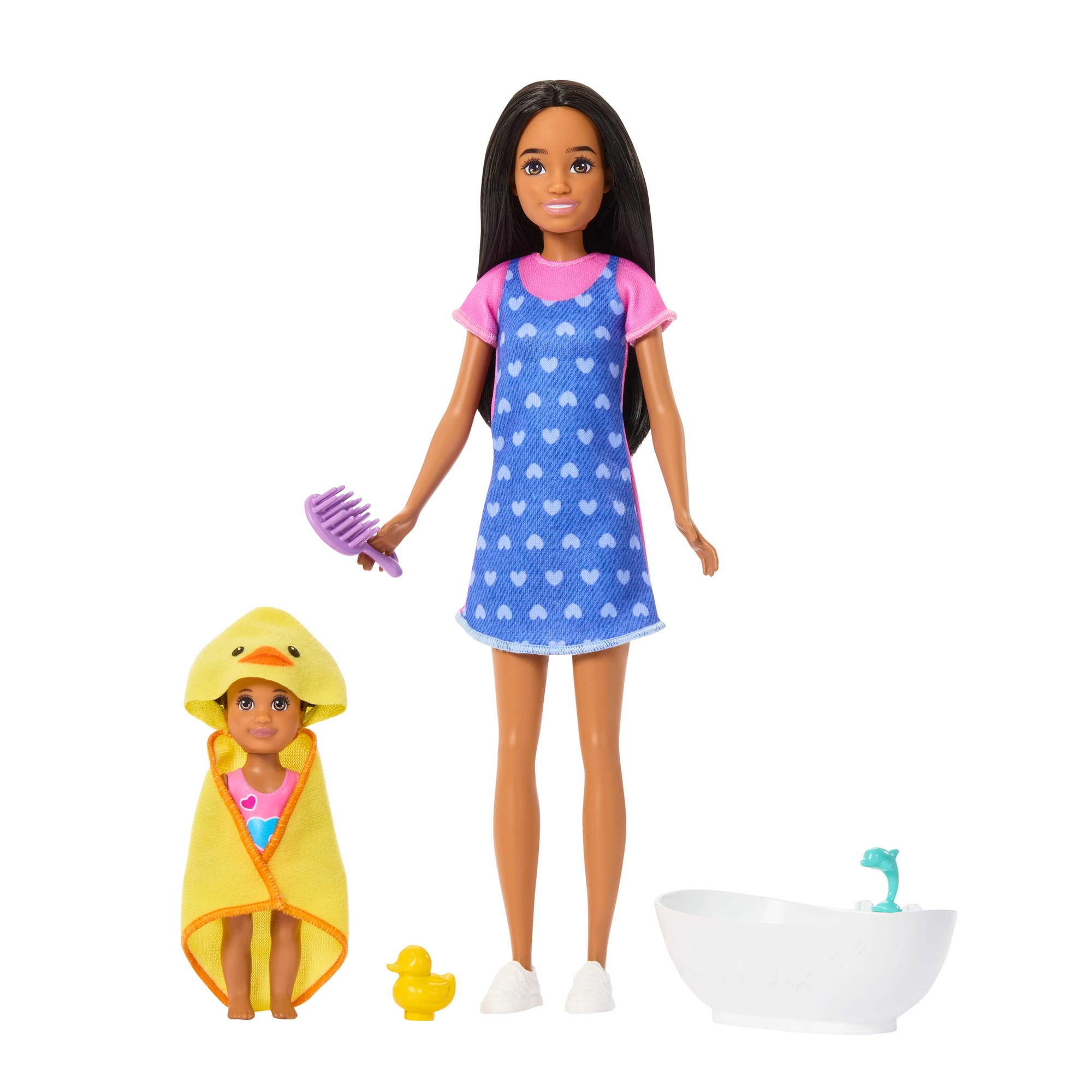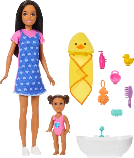 Το σετ BARBIE Skipper Μπάνιο μωρού προσφέρει αυθεντικό παιχνίδι φροντίδας για τους μικρούς. Η μεγαλύτερη αδελφή Skipper φορά φόρεμα με γαλάζια ποδιά με καρδούλες και άνετα αθλητικά, ενώ το μωρό απολαμβάνει το μπάνιο στη μικρή μπανιέρα με χαριτωμένα αξεσουάρ. Τα παιδιά μπορούν ξανά και ξανά να δημιουργούν τελετουργίες μπάνιου με παπάκι, πετσέτα με κουκούλα και «καλλυντικά».