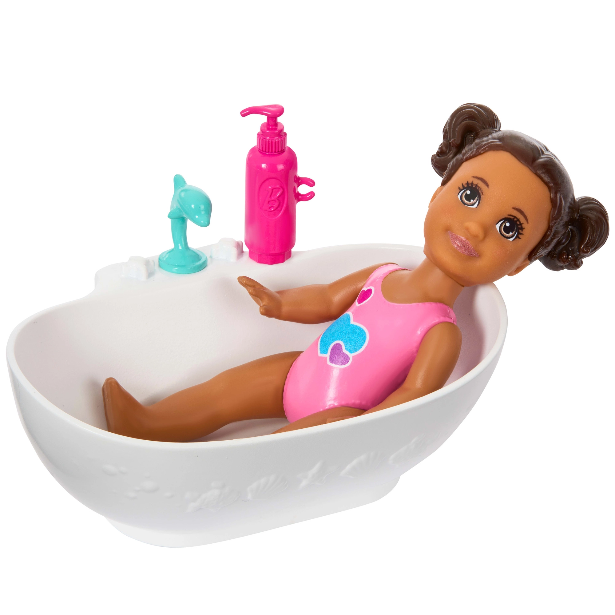Ανακαλύψτε το χαριτωμένο σετ για παιχνίδι μπάνιου – BARBIE Skipper μπέιμπι σίτερ με μωρό, μικρή μπανιέρα και πλούσια αξεσουάρ. Τα παιδιά θα αγαπήσουν τη ρεαλιστική ρουτίνα μπάνιου με παπάκι, πετσέτα με κουκούλα, «σαμπουάν», βούρτσα και άλλα αξεσουάρ. Εξαιρετική επιλογή για την ανάπτυξη της φαντασίας, της ενσυναίσθησης και των κοινωνικών δεξιοτήτων για παιδιά από 3 ετών.