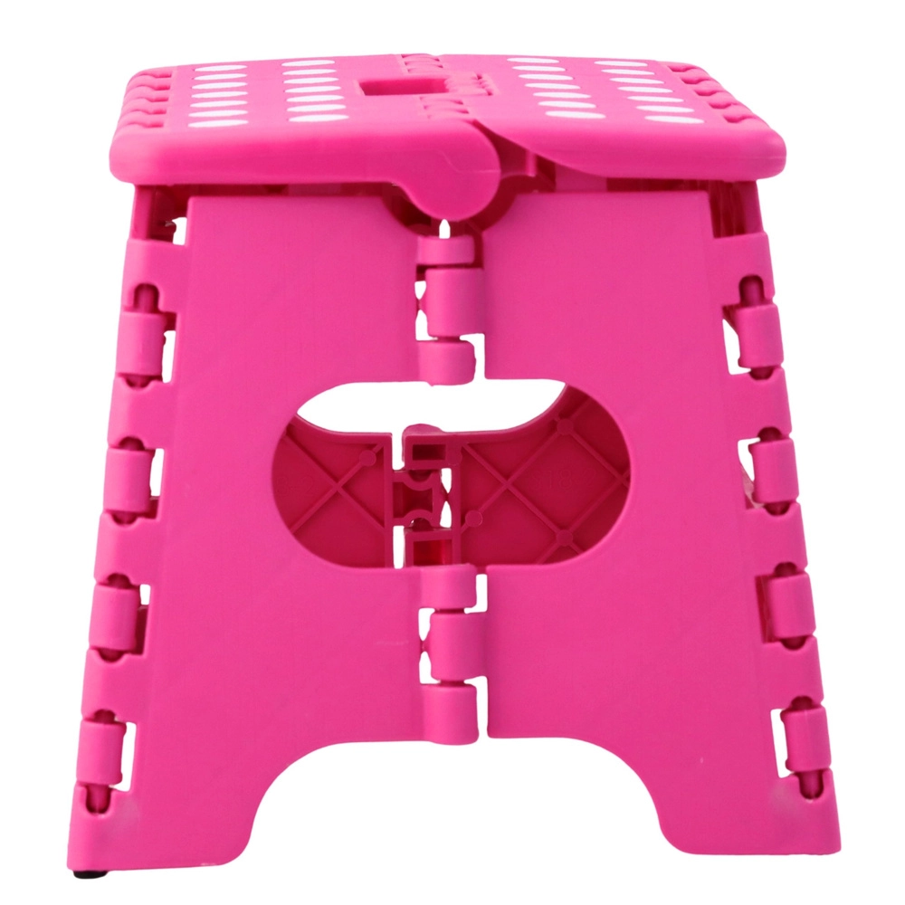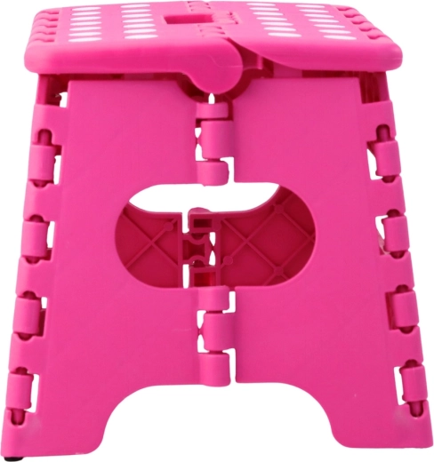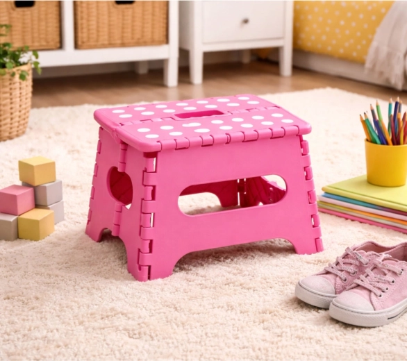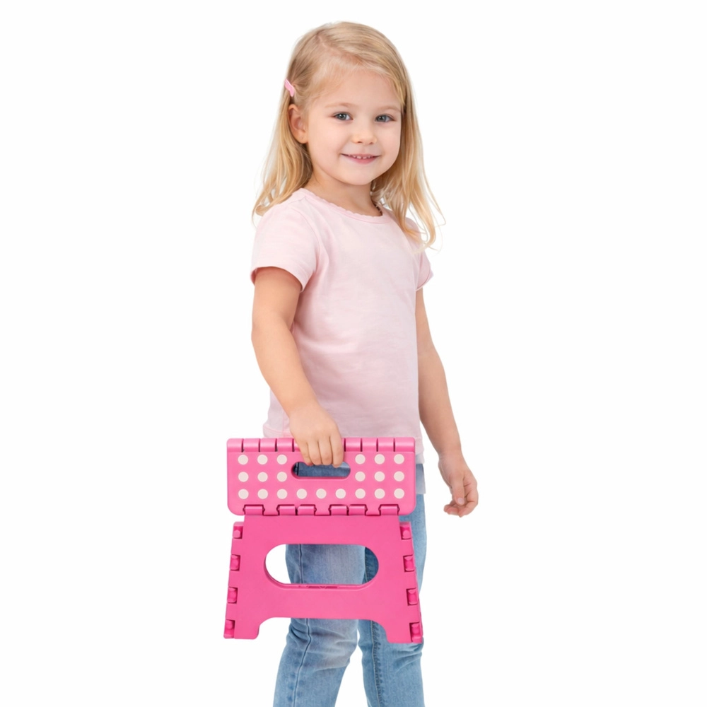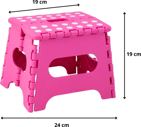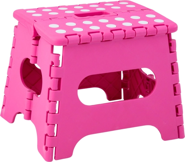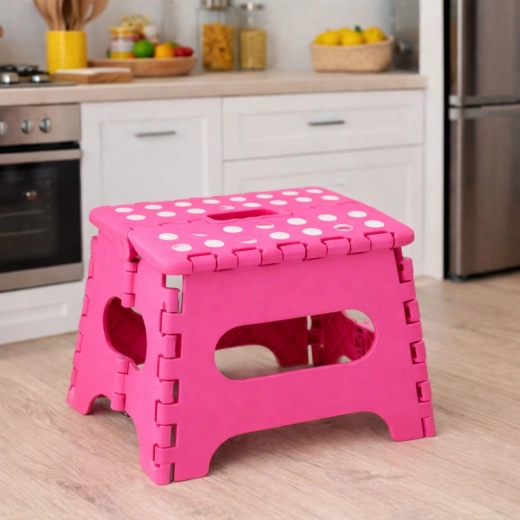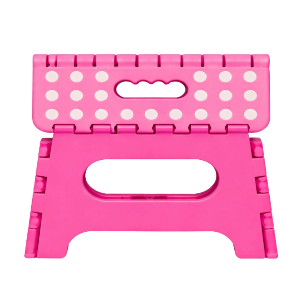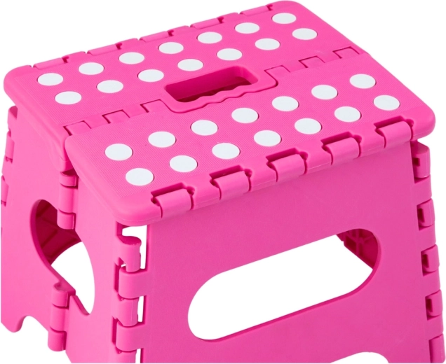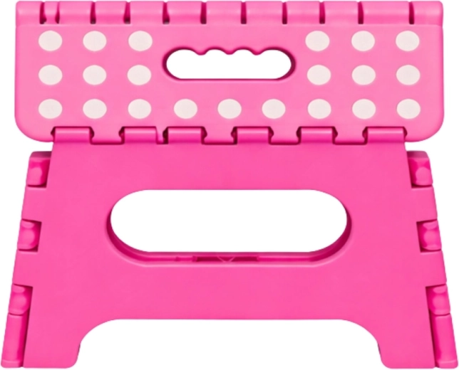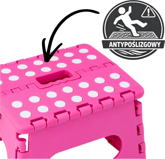 Το ροζ πτυσσόμενο σκαλοπάτι είναι κατασκευασμένο από ανθεκτικό πλαστικό που προσφέρει στιβαρότητα και μεγάλη αντοχή στον χρόνο. Η αντιολισθητική επάνω επιφάνεια με πουά αυξάνει την ασφάλεια στη χρήση, ακόμη και σε υγρές συνθήκες. Η ενσωματωμένη λαβή επιτρέπει γρήγορη μεταφορά και εύκολη αναδίπλωση σε επίπεδη μορφή για εξοικονόμηση χώρου.