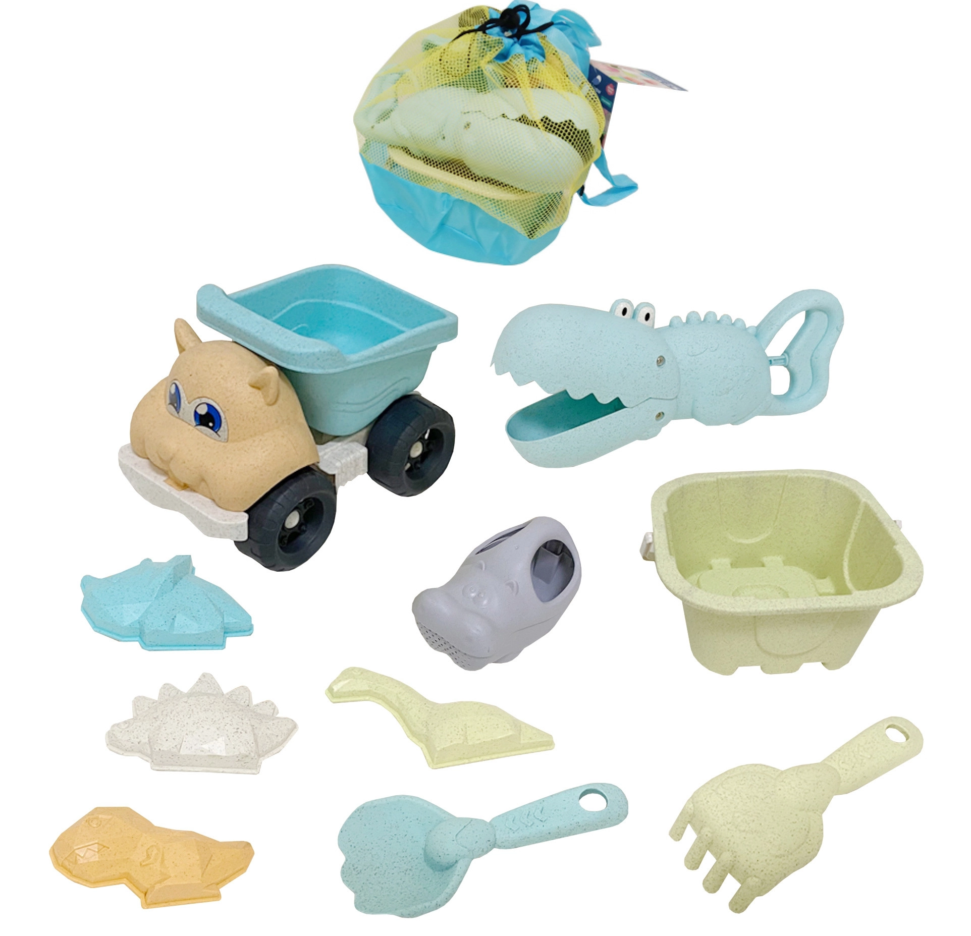 Κουβαδάκι, ποτιστήρι, 4 κουπάτ, φτυάρι, δαγκάνα κροκόδειλου, τσουγκράνα και ανατρεπόμενο φορτηγάκι – πλήρης εξοπλισμός για κάστρα στην άμμο και παιχνίδια στο νερό.