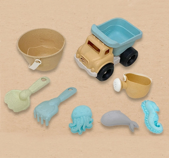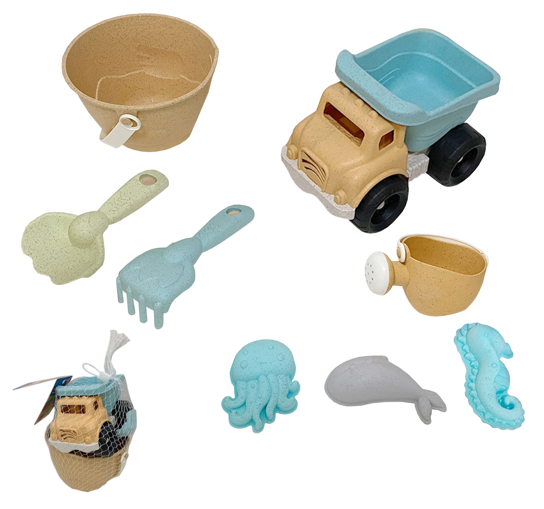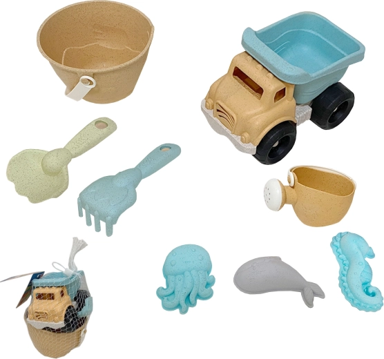 - ποτιστήρι, κουβάς, 3 καλούπια, φτυαράκι, τσουγκράνα, ανατρεπόμενο φορτηγό