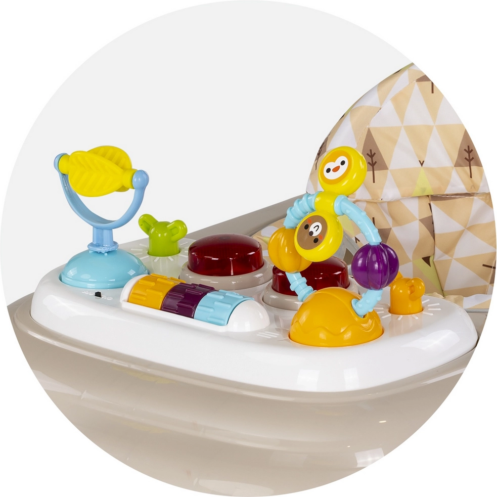 Ο διαδραστικός πίνακας με πολύχρωμα παιχνίδια, κουμπιά, φωτεινά εφέ και 12 μελωδίες υποστηρίζει την ανάπτυξη της λεπτής κινητικότητας, της αισθητηριακής αντίληψης και του συντονισμού. Ο πίνακας είναι αποσπώμενος, ώστε το παιδί να μπορεί να παίζει και εκτός της περπατούρας. Η κατασκευή διπλώνεται εύκολα για εξοικονόμηση χώρου και απλή μεταφορά.