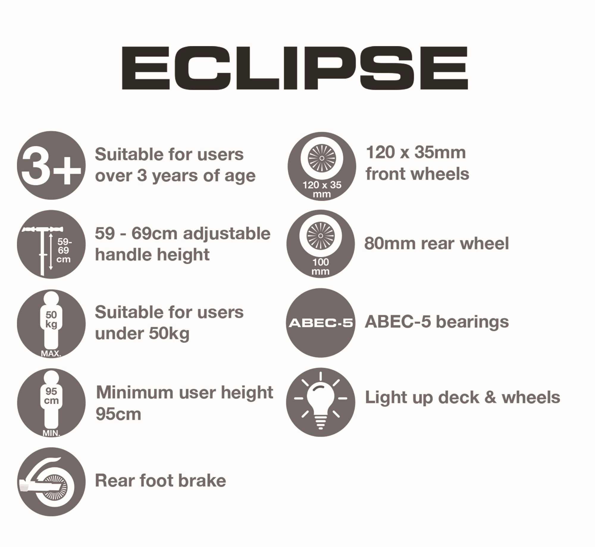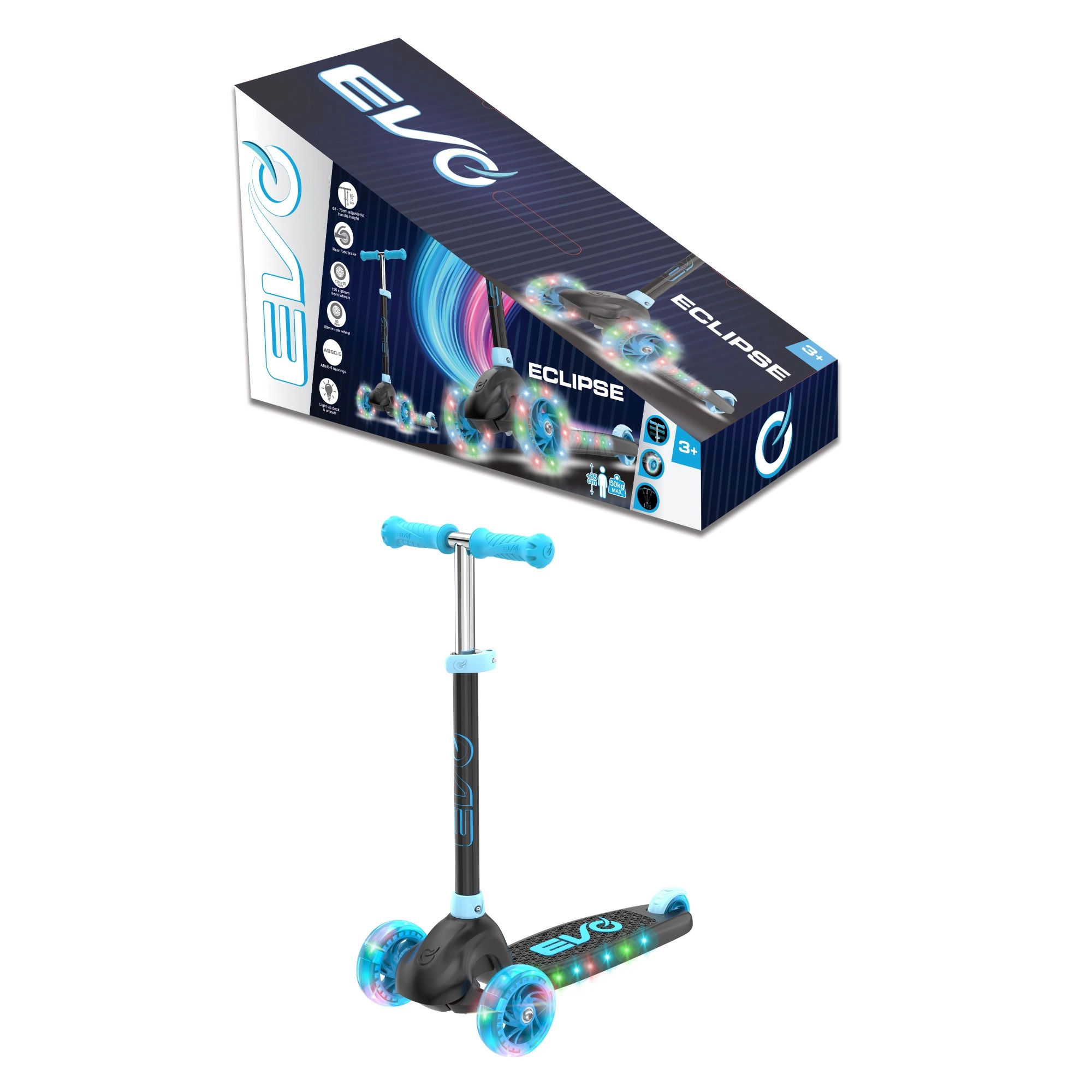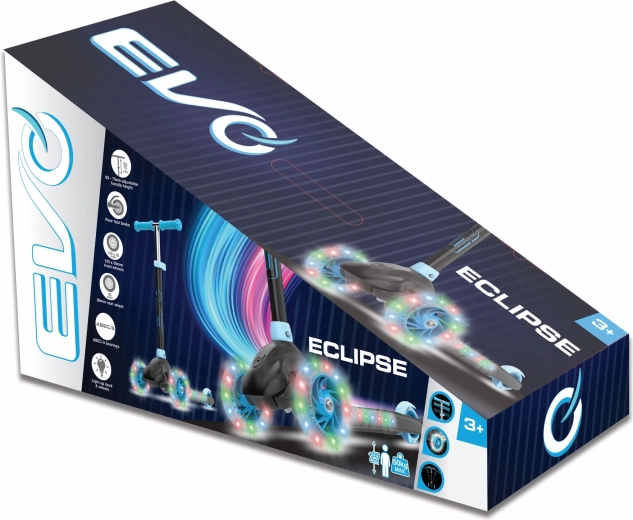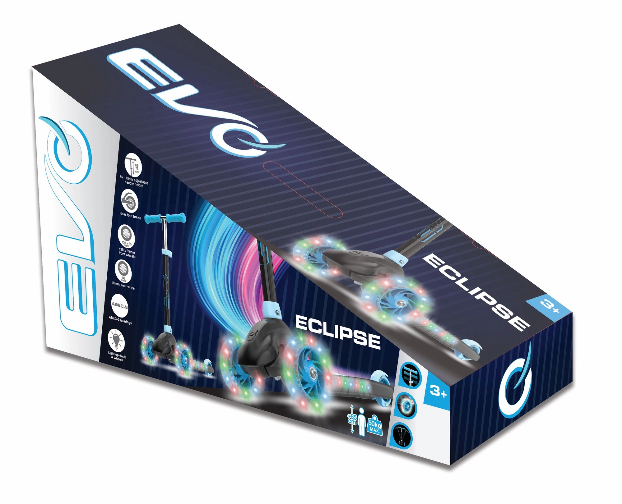Το πατίνι EVO Eclipse είναι σχεδιασμένο για τα πρώτα βήματα στον κόσμο της οδήγησης – οι τρεις τροχοί προσφέρουν υψηλή σταθερότητα, ενώ η ελαφριά κατασκευή και το ποδόφρενο στον πίσω τροχό προσδίδουν σιγουριά στο σταμάτημα. Ο LED φωτισμός στους τροχούς και στη βάση μετατρέπει κάθε διαδρομή σε εντυπωσιακή φωτεινή παράσταση και βελτιώνει την ορατότητα στο ημίφως.