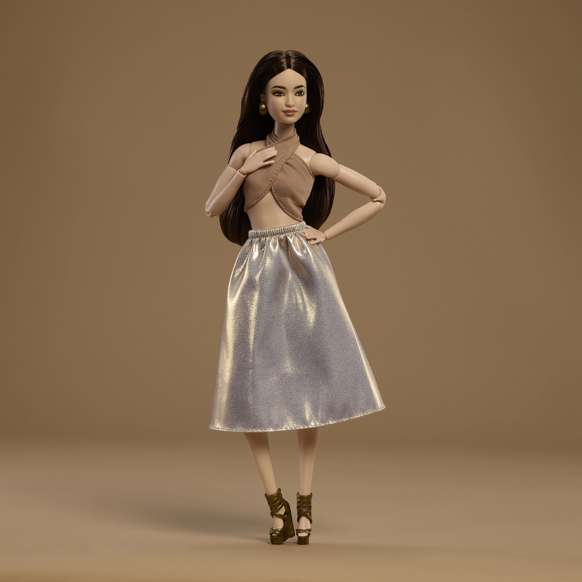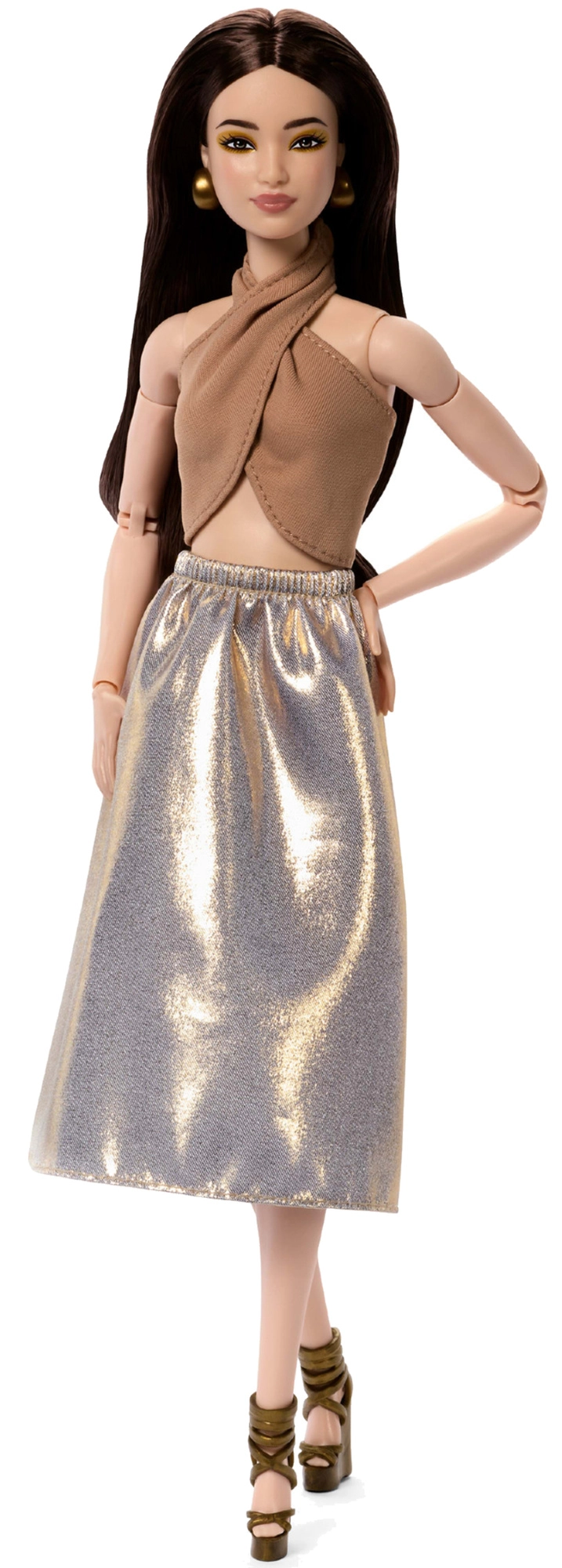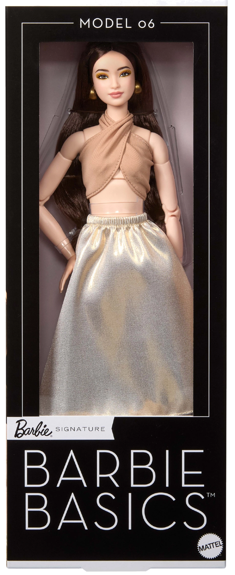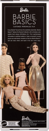 Το μοντέλο 06 από τη σειρά Barbie Signature Basics προσφέρει μινιμαλιστική κομψότητα σε αποχρώσεις ανοιχτού καφέ και χρυσού. Ο συνδυασμός ενός κομψού τοπ και μιας άνετης φούστας αναδεικνύει μια μοντέρνα, διαχρονική εμφάνιση. Η κούκλα έχει ανοιχτόχρωμη επιδερμίδα, λεπτή σιλουέτα και αρμονικό, διακριτικό μακιγιάζ που τονίζει τη φυσική της ομορφιά.