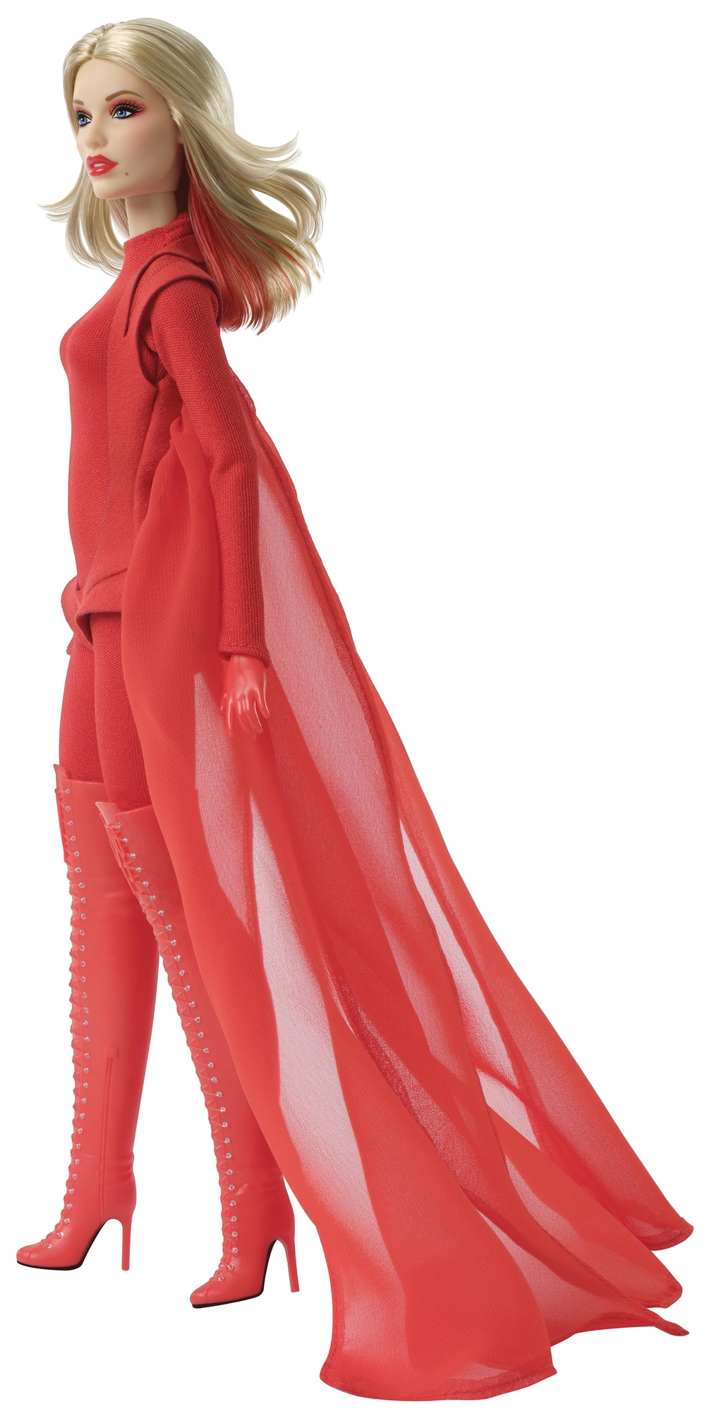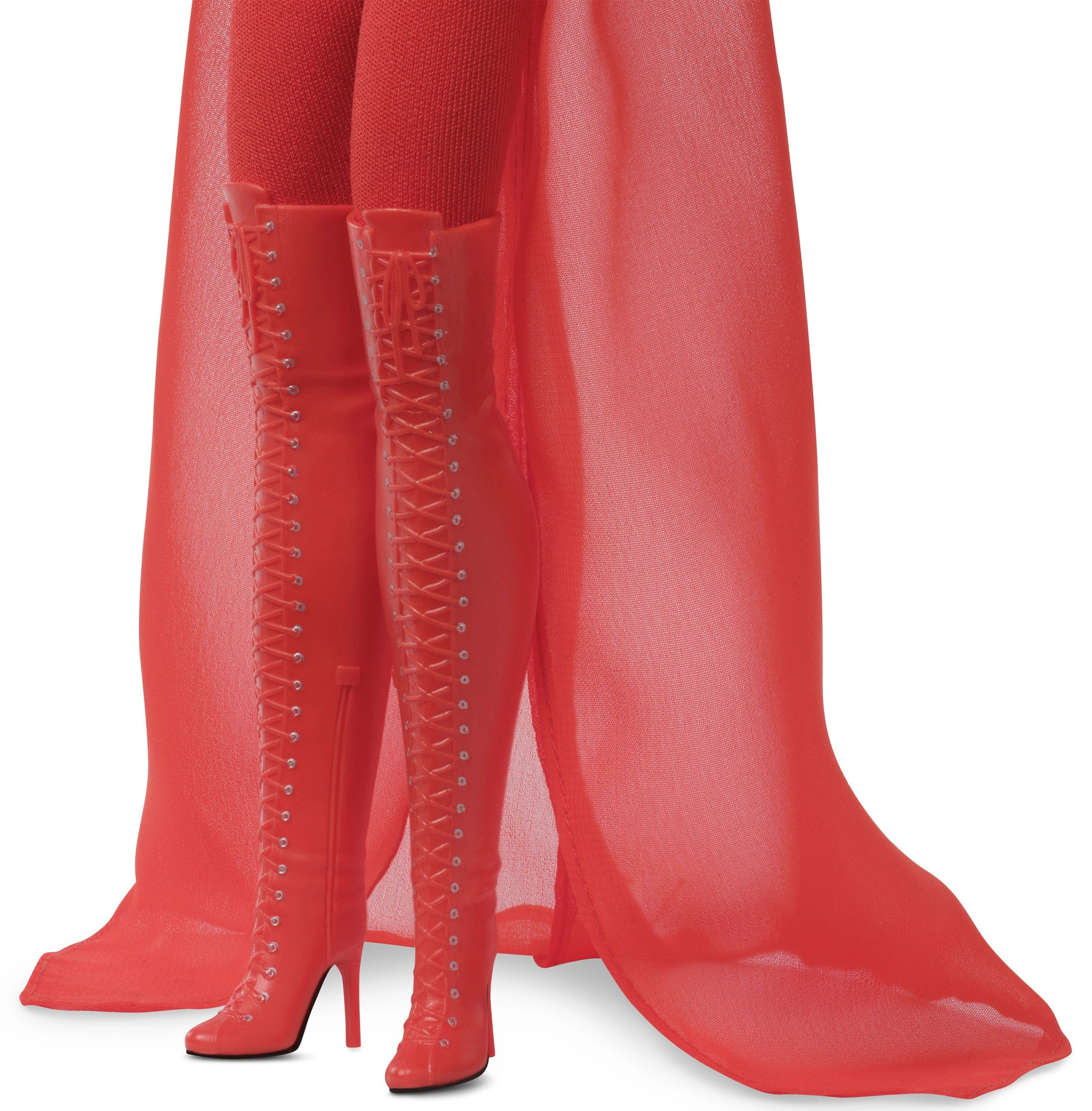 Το outfit αποτελείται από εφαρμοστό κόκκινο ολόσωμο με διάφανο εφέ και κοντό επάνω μέρος που καταλήγει σε μακριά ρέουσα κάπα. Το look ολοκληρώνουν οι μπότες πάνω από το γόνατο με κορδόνια και ψηλά τακούνια – πραγματικό statement κομμάτι για βιτρίνα.