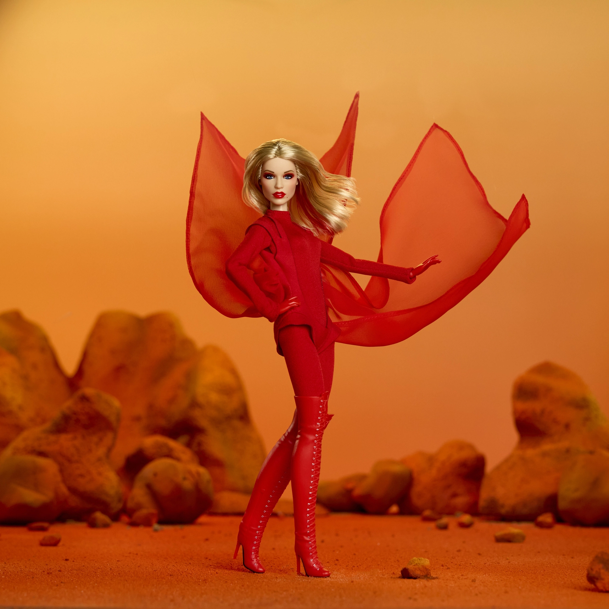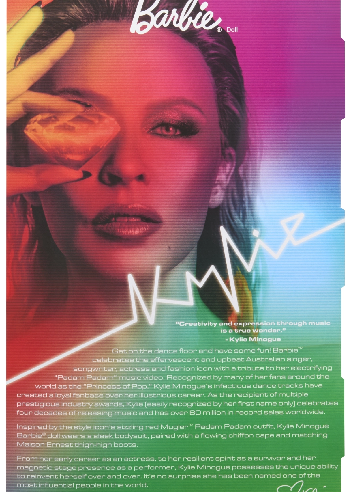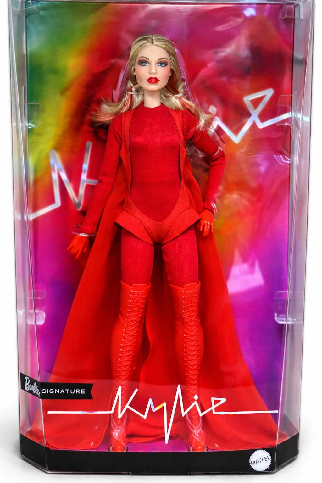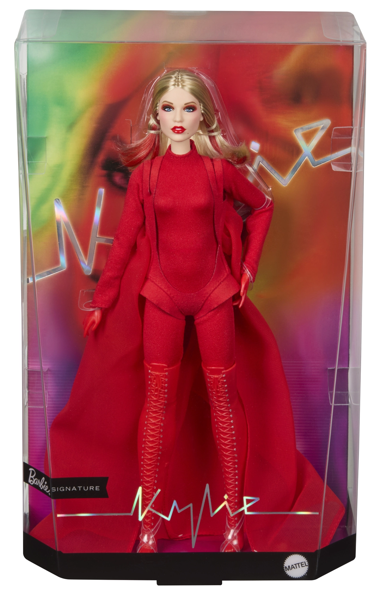 Αυτή η συλλεκτική έκδοση της Barbie αποτίνει φόρο τιμής σε εμπνευσμένες γυναίκες στη σειρά Role Models. Η κούκλα απεικονίζει την Kylie Minogue σε δραματική κόκκινη εμφάνιση εμπνευσμένη από μουσικό βίντεο, με μακριά ξανθά μαλλιά και διακριτές κόκκινες ραβδώσεις, γαλάζια μάτια και προσεγμένο μακιγιάζ για αυθεντικό, σκηνικό look.