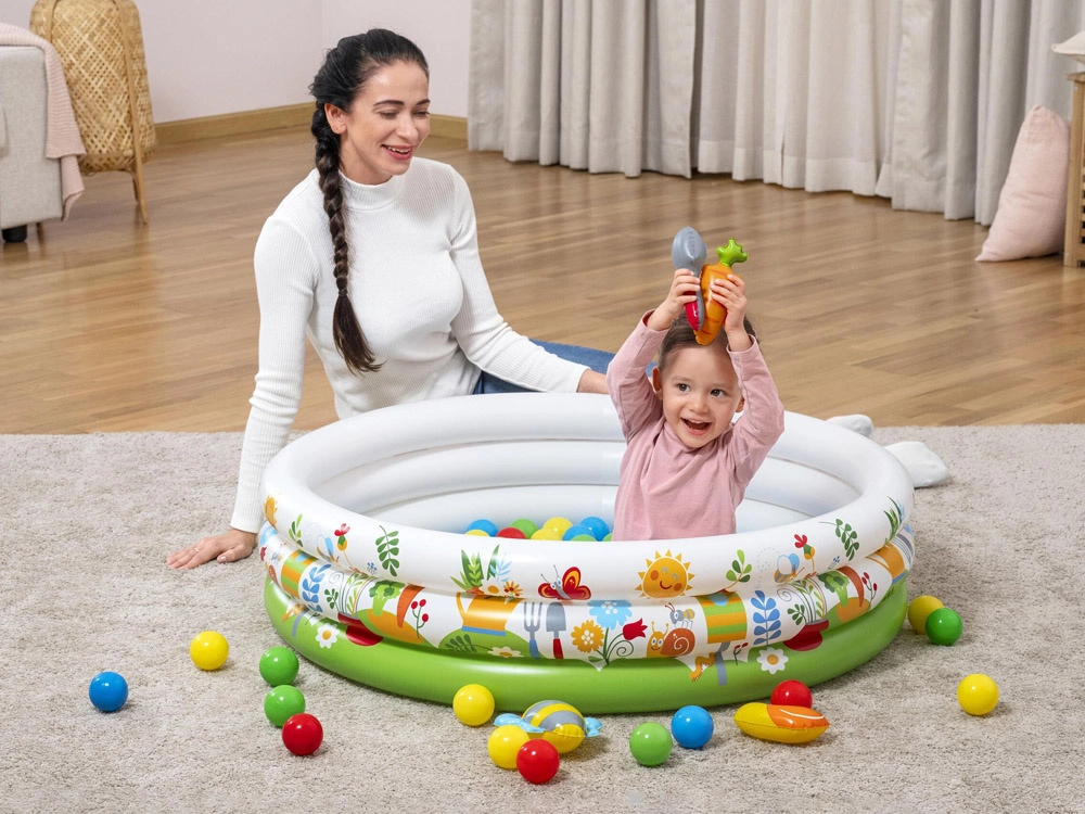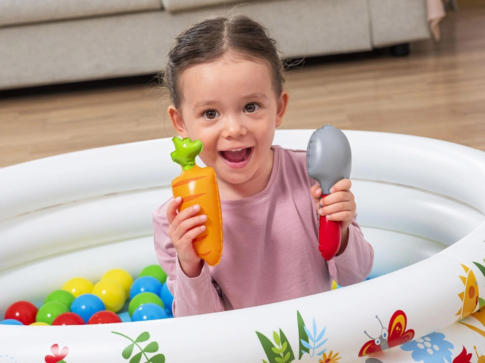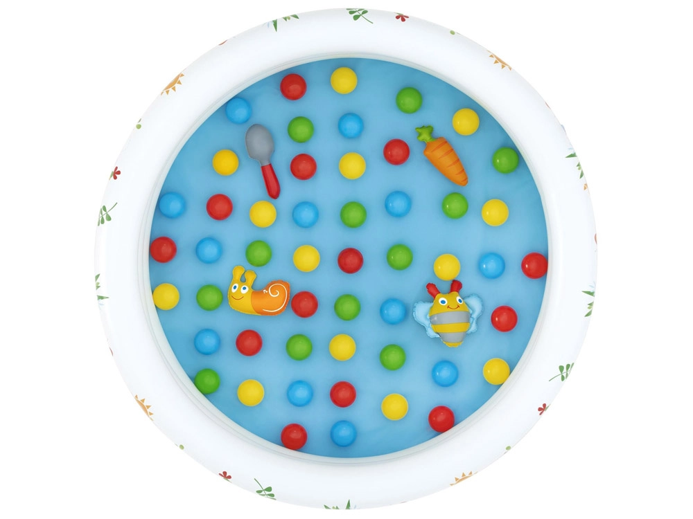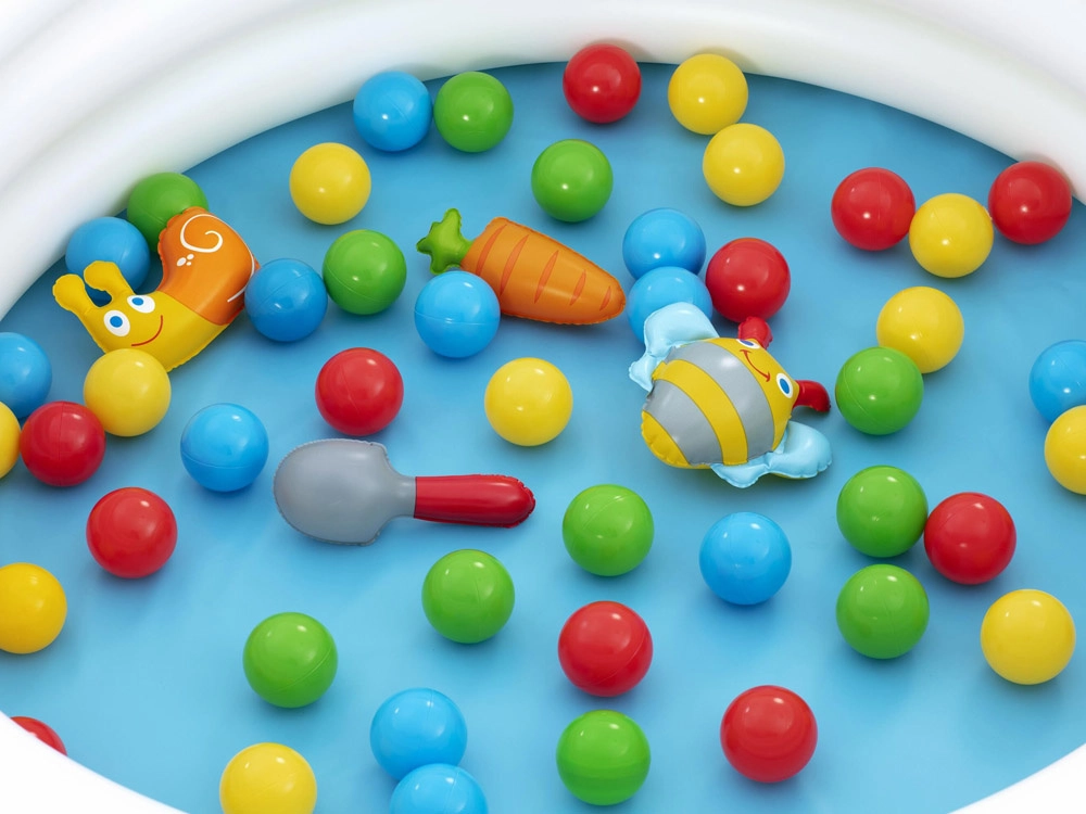 Περιλαμβάνονται 46 πολύχρωμα μπαλάκια και 4 ανοιγόμενες μπάλες-έκπληξη με χαριτωμένα παιχνίδια (π.χ. σαλιγκάρι, μελισσούλα, καροτάκι, κουταλάκι), που ενθαρρύνουν την περιέργεια και τη δημιουργικότητα. Η εύκολη εγκατάσταση, η απλή συντήρηση και το παρεχόμενο επιδιορθωτικό αυτοκόλλητο εξασφαλίζουν ξέγνοιαστη χρήση.