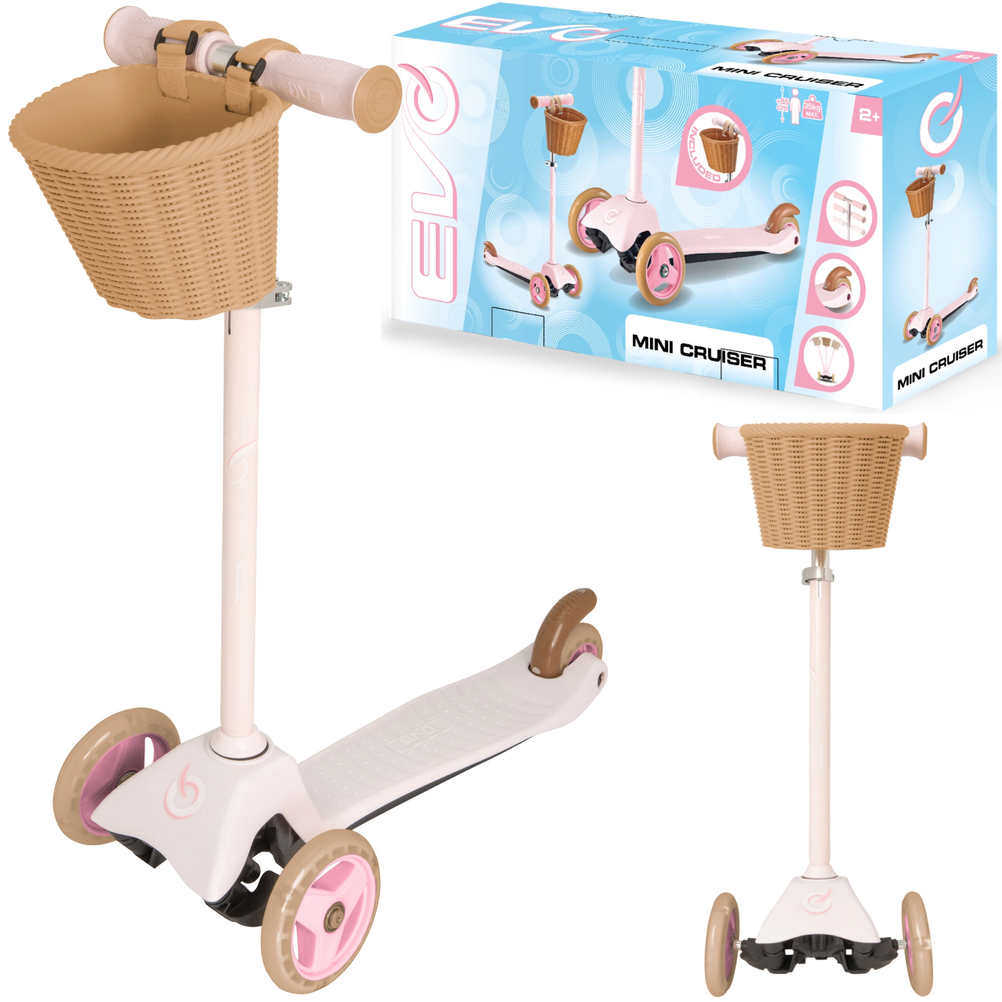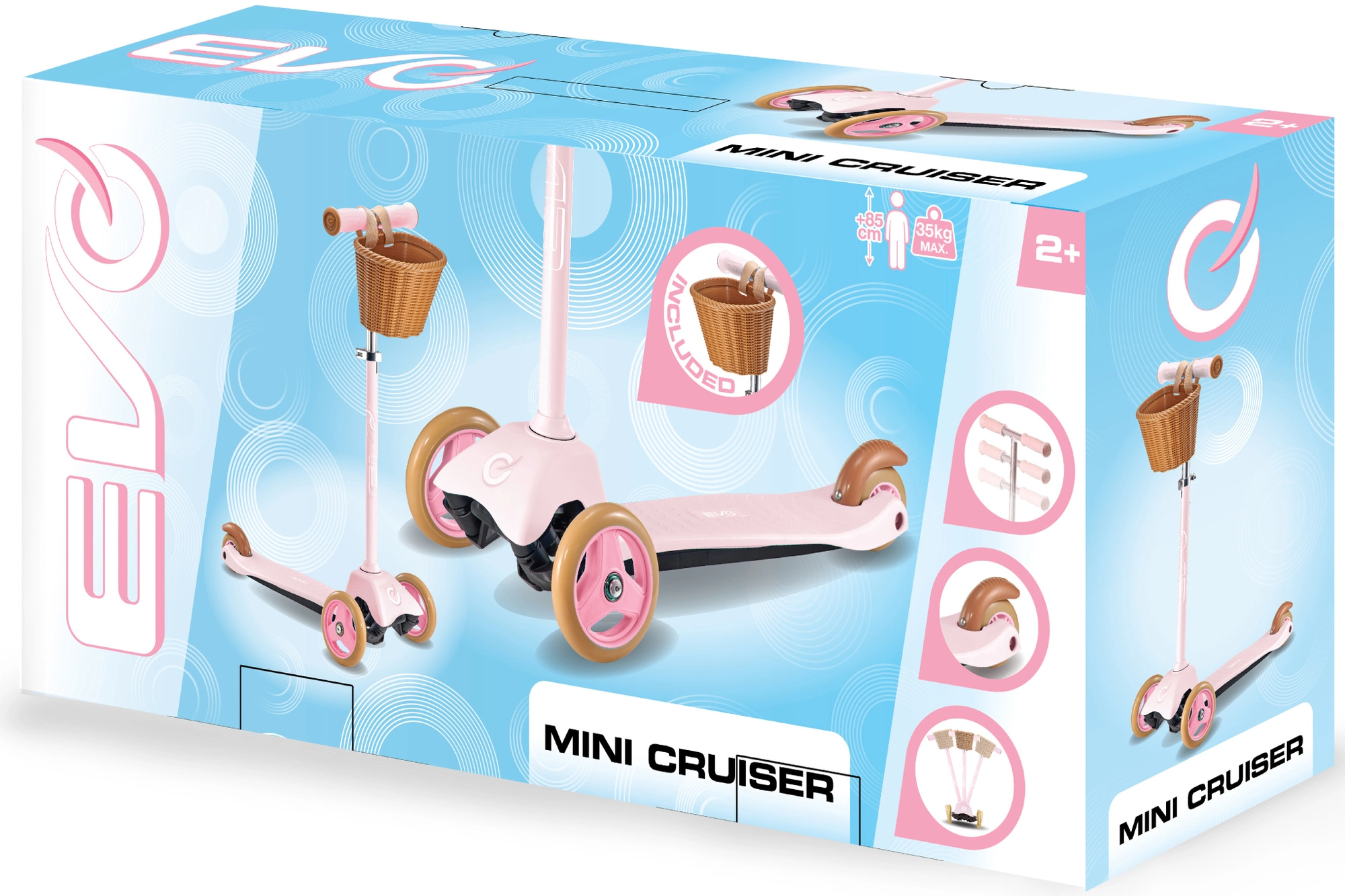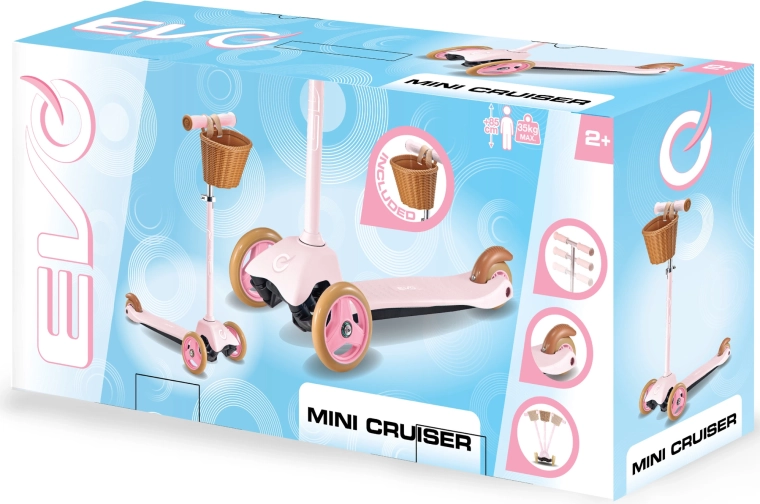 Το ροζ πατίνι EVO Mini Cruiser είναι ιδανικό για τους μικρότερους αναβάτες από 2 ετών. Χάρη στους τρεις τροχούς, το φαρδύ και σταθερό πάτημα και το πίσω φρένο ποδιού, τα παιδιά μαθαίνουν ισορροπία και συντονισμό με ασφάλεια και διασκέδαση. Τα ρυθμιζόμενα καθ’ ύψος τιμόνια μεγαλώνουν μαζί με το παιδί και το αποσπώμενο καλαθάκι χωρά μικροαντικείμενα για τις βόλτες.