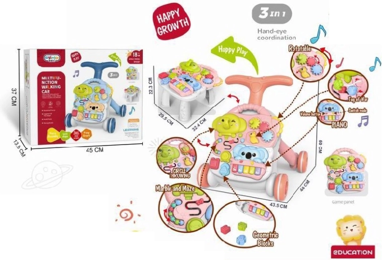 Η πολυλειτουργική περπατούρα και εκπαιδευτικό τραπεζάκι 3 σε 1 υποστηρίζει τη φυσική ανάπτυξη του παιδιού από 12 μηνών. Προσφέρει περπατούρα, τραπεζάκι και αποσπώμενο διαδραστικό πάνελ με πιάνο και στοιχεία για την ανάπτυξη της λεπτής και αδρής κινητικότητας, των αισθήσεων και της αναγνώρισης σχημάτων, χρωμάτων και ήχων. Χάρη στη σταθερή κατασκευή, τη δυνατότητα γεμίσματος των ποδιών με νερό ή άμμο και τους τροχούς με αντιολισθητική επένδυση και κλείδωμα, το παιχνίδι είναι ασφαλές και ομαλό.