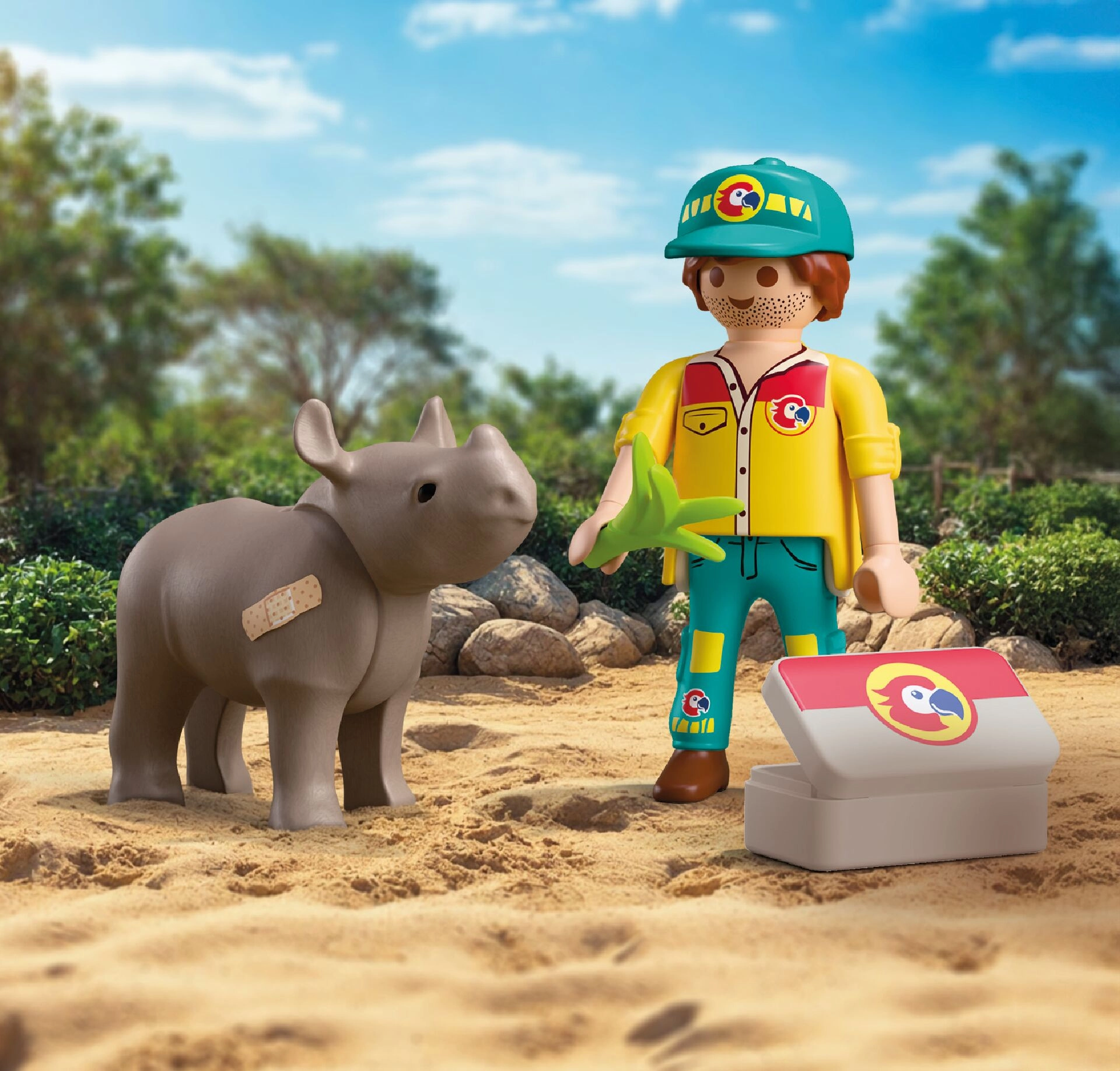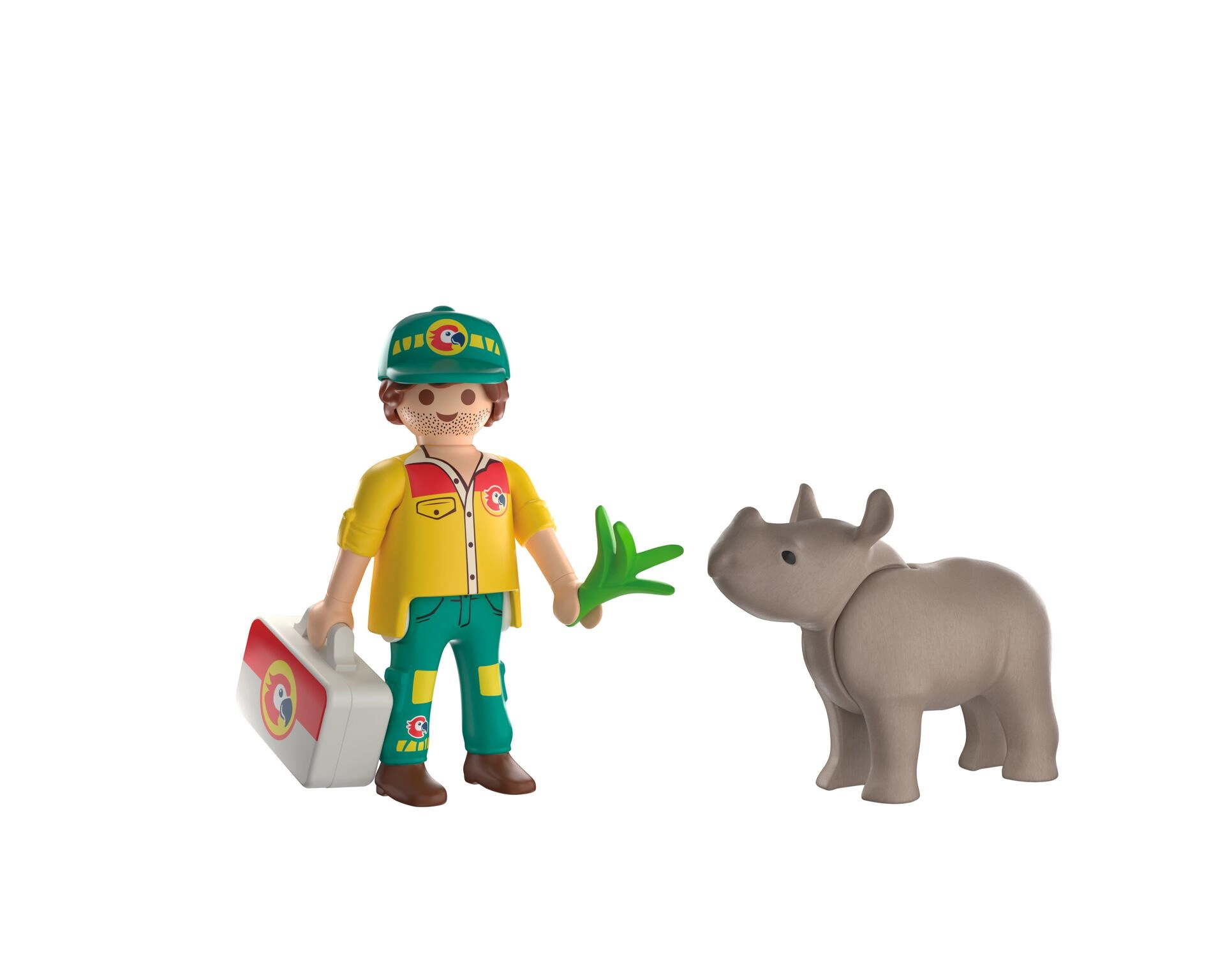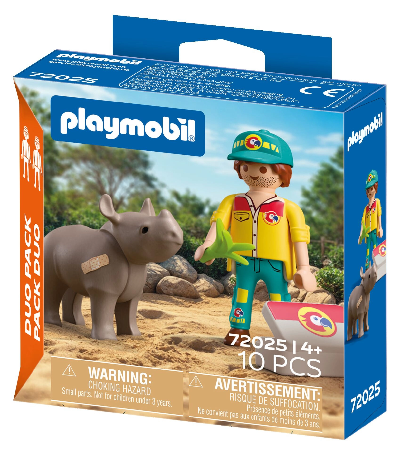 Μπείτε στον κόσμο της PLAYMOBIL και βοηθήστε τον τραυματισμένο ρινόκερο να σταθεί ξανά στα πόδια του. Αυτό το σετ της σειράς Duo Pack προσφέρει δύο λεπτομερώς σχεδιασμένες φιγούρες και ένα σύνολο πρακτικών αξεσουάρ, με τα οποία τα παιδιά μπορούν να ζωντανέψουν αμέτρητες ιστορίες από τον ζωολογικό κήπο της Playmo-City. Τα ρεαλιστικά εργαλεία και ο εξοπλισμός καλλιεργούν τη φαντασία και την ευαισθησία για τη φροντίδα των ζώων.