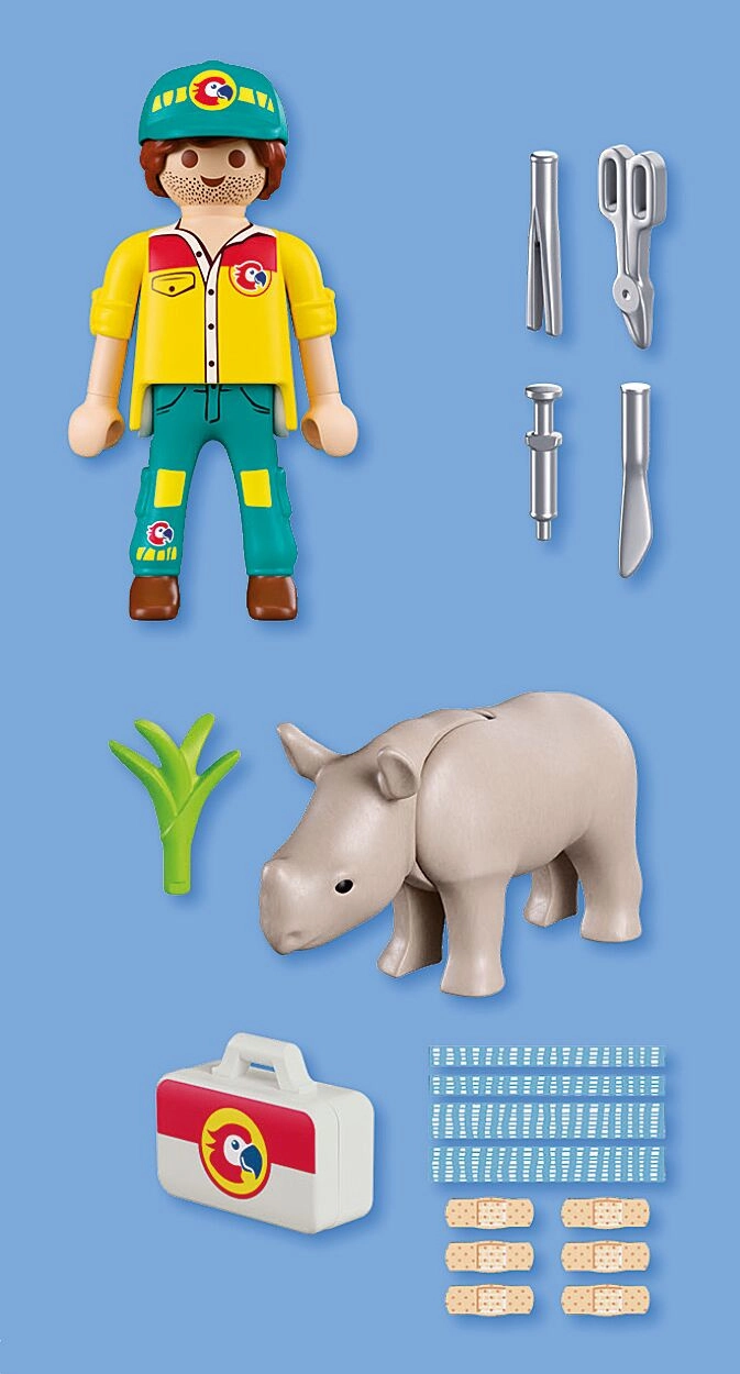 - Φιγούρα φροντιστή, φιγούρα ρινόκερου, ιατρική τσάντα, σετ ιατρικών εργαλείων, φύλλο αυτοκόλλητων με επιθέματα και επιδέσμους, τμήμα φυτού