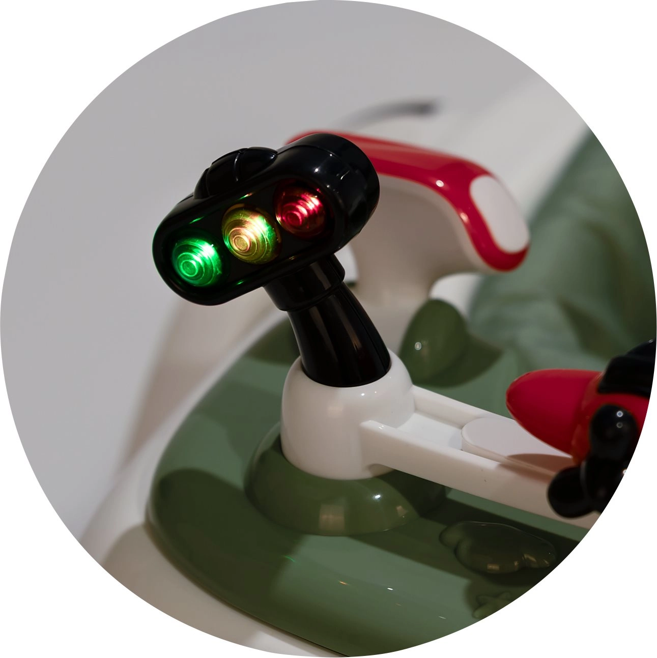Η ασφάλεια είναι προτεραιότητα: σταθερή βάση, αντιολισθητικά πέλματα, στάσεις ασφαλείας, κλειδωμένοι τροχοί και δυνατότητα ρύθμισης της ταχύτητας μέσω ρυθμιστή στους τροχούς. Το ρυθμιζόμενο ύψος προσαρμόζεται στην ανάπτυξη του παιδιού και εξασφαλίζει άνεση ακόμη και σε παρατεταμένη χρήση. Για τα φωτεινά και μουσικά εφέ απαιτούνται μπαταρίες (δεν περιλαμβάνονται).