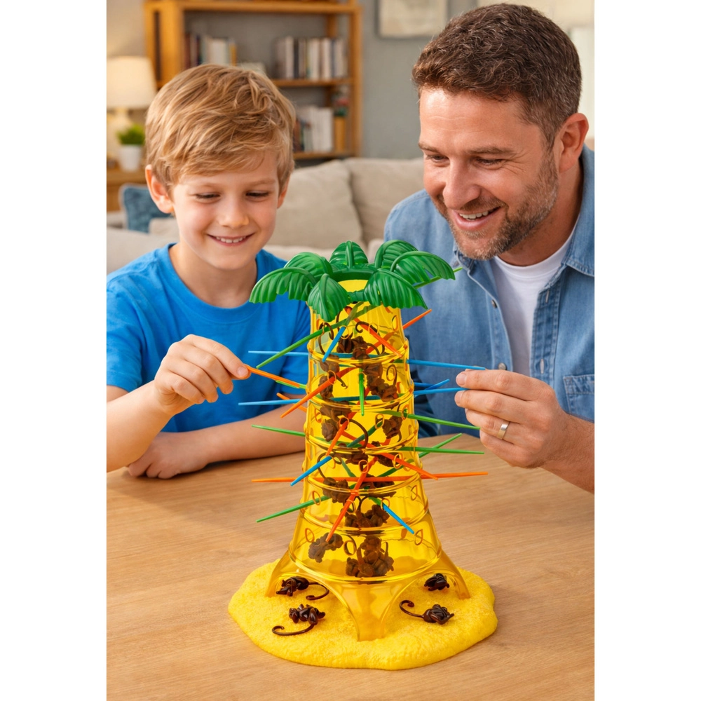 Στήστε τον φοίνικα, περάστε τα πολύχρωμα ραβδάκια και κρεμάστε τις μαϊμούδες. Οι παίκτες εναλλάσσονται ρίχνοντας το ζάρι και τραβώντας ραβδάκι στο χρώμα που ορίζει. Κάθε απερίσκεπτη κίνηση μπορεί να ρίξει μαϊμούδες – κερδίζει όποιος ρίξει τις λιγότερες. Ιδανικό για οικογενεινά απογεύματα, παιδικά πάρτι και γρήγορα μίνι παιχνίδια.