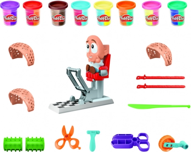 - Φιγούρα με καρέκλα, βάση εξώθησης, ψαλίδι, χτένα, καλούπια, κυπελλάκια πλαστελίνης Play-Doh (πολλά χρώματα)