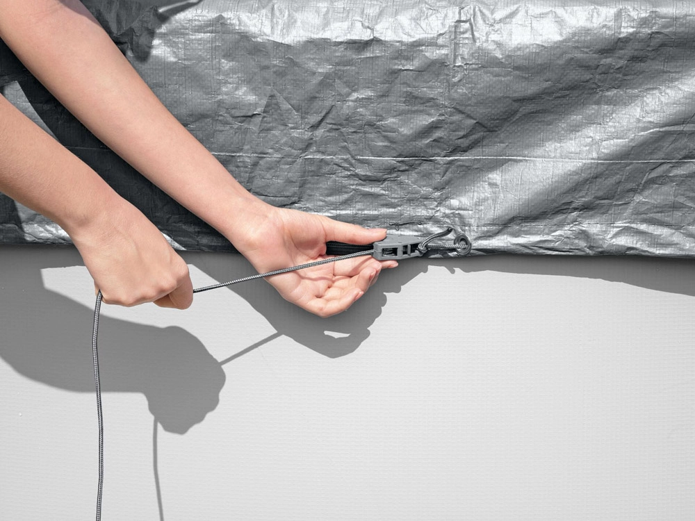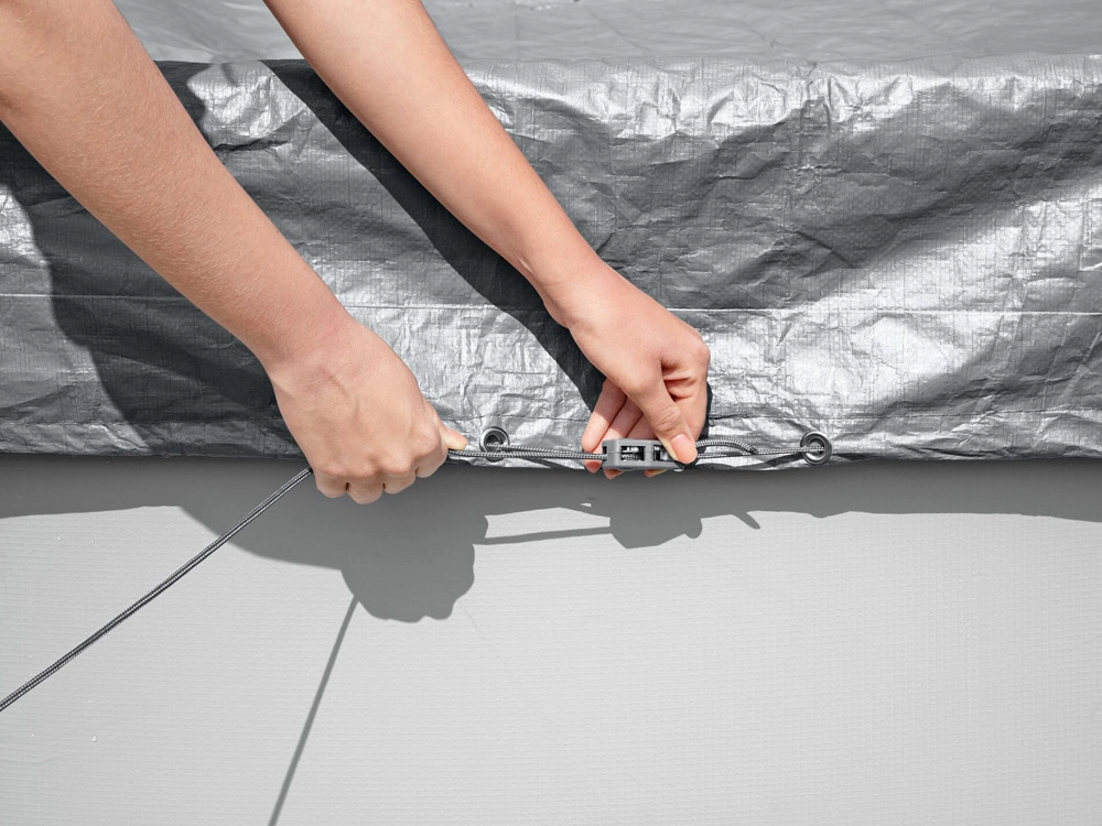 Ο μηχανισμός σύσφιξης και το κορδόνι σύσφιξης κρατούν το κάλυμμα σταθερά στη θέση του και βελτιώνουν την πρόσφυση σε όλη την περίμετρο της πισίνας.