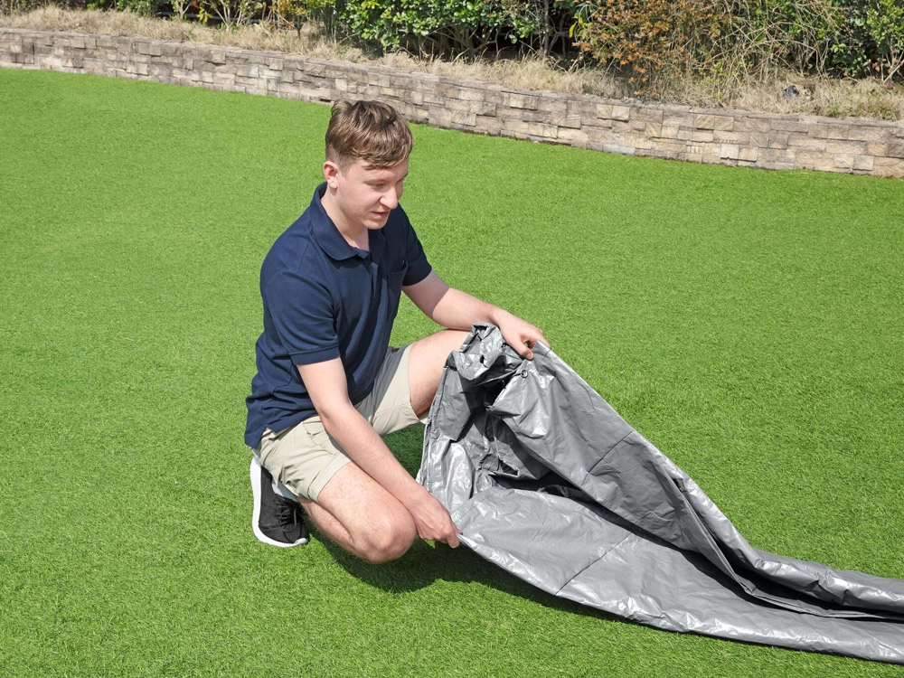 Έξυπνες αποστραγγιστικές οπές επιτρέπουν τη διέλευση του βρόχινου νερού, ώστε να μην σχηματίζονται λιμνούλες στο κάλυμμα. Ο αντιανεμικός μηχανισμός σύσφιξης και το κορδόνι σύσφιξης εξασφαλίζουν σφιχτή εφαρμογή στην περίμετρο, για να μένει το κάλυμμα στη θέση του ακόμη και σε δυσμενείς καιρικές συνθήκες.