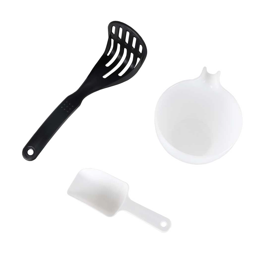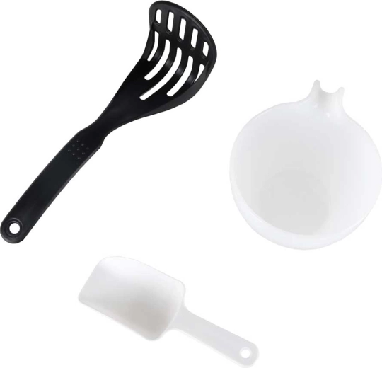 - δοχείο με βρυσάκι και λαβή, καπάκι, αποστραγγιστική σχάρα, ποτηράκι για εκχύλισμα (17 × 7 cm), κουταλάκι (15 × 5,5 cm), πιεστήριο (22 × 7,5 cm)