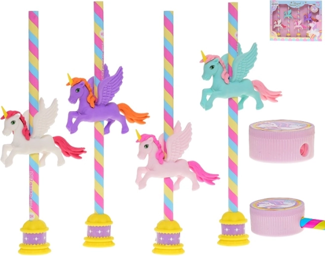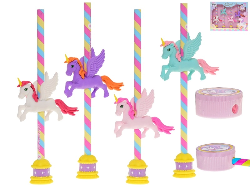 Μαγικό σετ γραφικής ύλης με θέμα μονόκερους για χαρούμενο γράψιμο και ζωγραφική. Περιλαμβάνει 4 ποιοτικά μολύβια HB με γόμα στο άκρο και πρακτική ξύστρα. Ο χρωματιστός, παιχνιδιάρικος σχεδιασμός ενθουσιάζει τα παιδιά και χάρη στο ομαλό γράψιμο και τη εύκολη γόμα η σχολική εργασία και η δημιουργία γίνονται διασκέδαση.