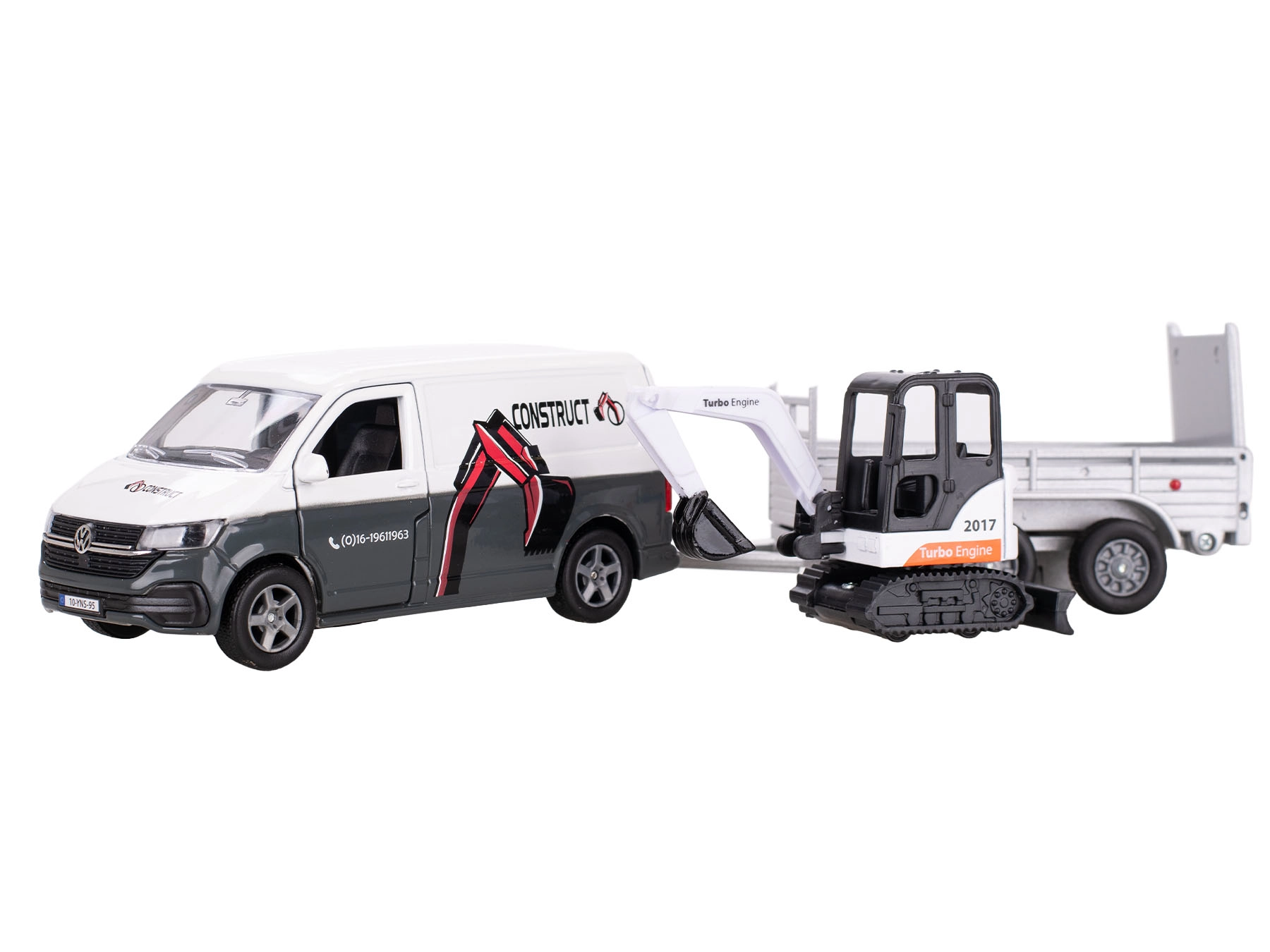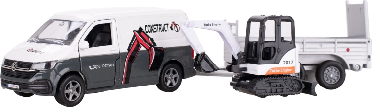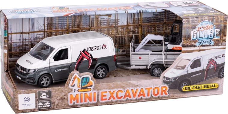 Με το σετ Kids Globe Traffic τα παιδιά δημιουργούν εύκολα το δικό τους εργοτάξιο. Ο ρεαλιστικός VW Transporter με pull-back μεταφέρει με ασφάλεια τον μίνι εκσκαφέα στο αποσπώμενο ρυμουλκούμενο, ώστε να ξεκινήσει αμέσως τις «εκσκαφικές» εργασίες. Η ανθεκτική κατασκευή από μέταλλο και πλαστικό εξασφαλίζει μεγάλη διάρκεια ζωής ακόμη και με έντονο παιχνίδι.