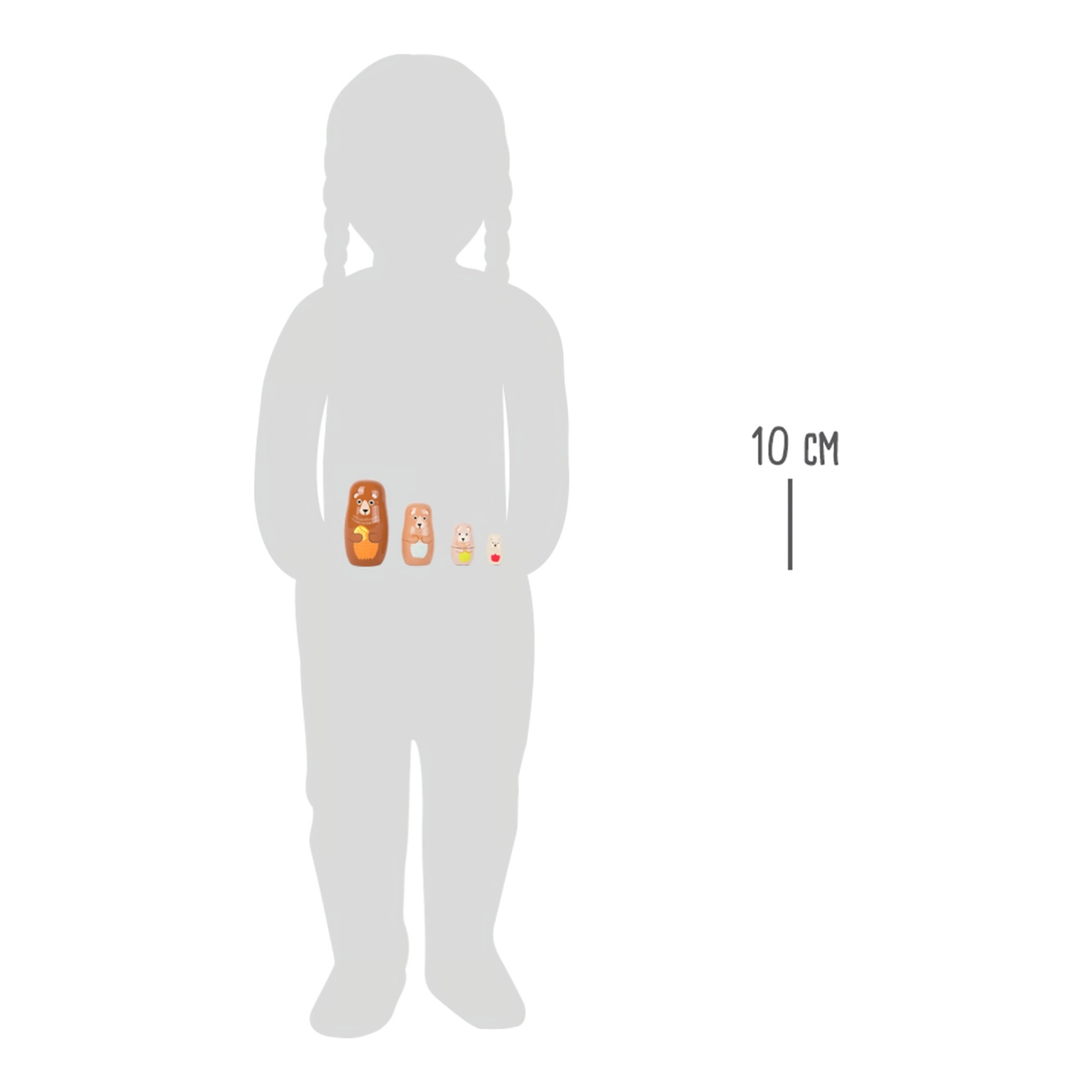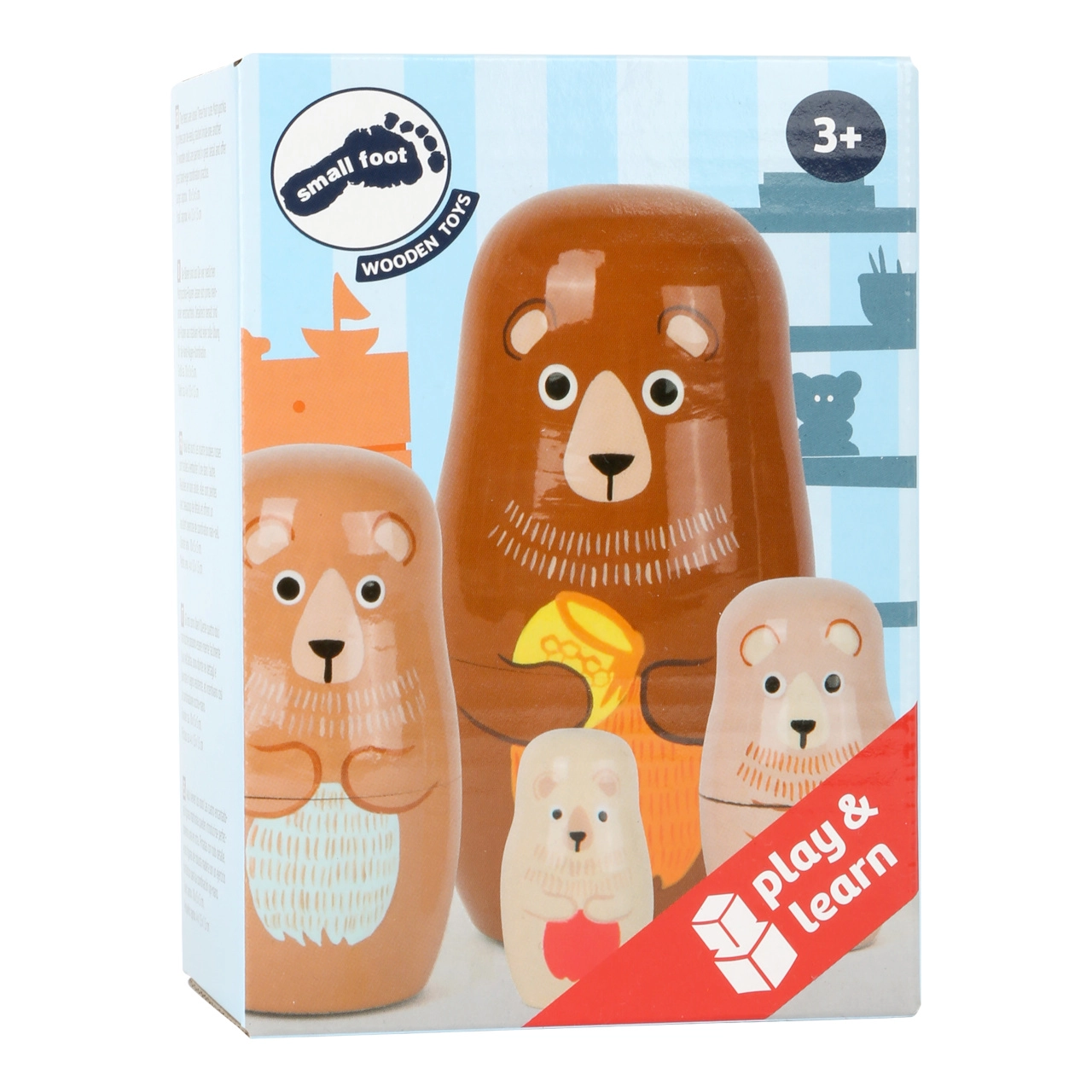 Αυτή η κλασική ξύλινη ματριόσκα παρουσιάζει μια αρκούδα–μαμά με τα μικρά της, τα οποία μπαίνουν το ένα μέσα στο άλλο ανάλογα με το μέγεθος. Τα παιδιά εξασκούν την υπομονή, τη λογική και την επιδεξιότητα, ενώ απολαμβάνουν τη χαρά της ανακάλυψης του ποιος κρύβεται μέσα.
